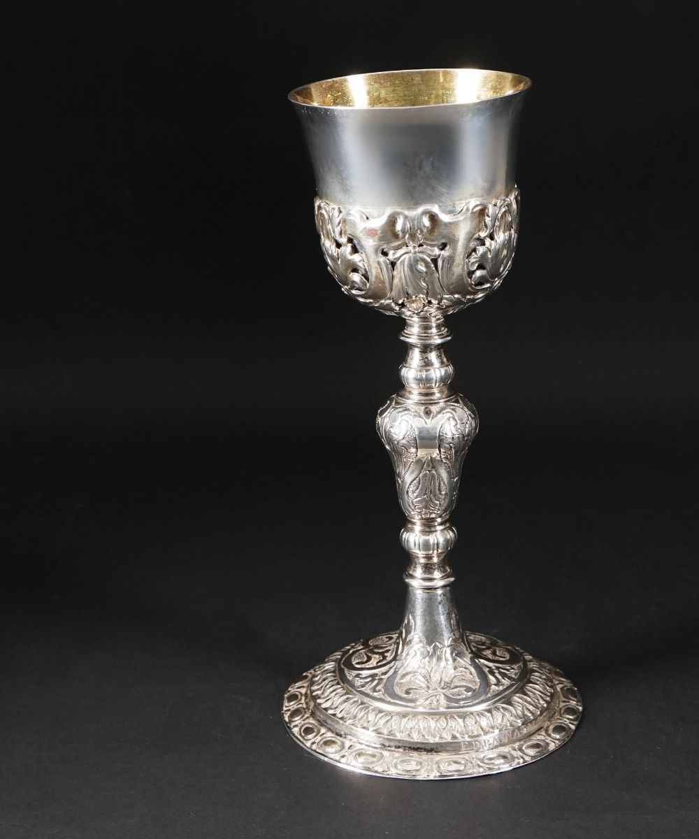 Calice in argento con stelo tornito inciso a motivi fogliati così come il...