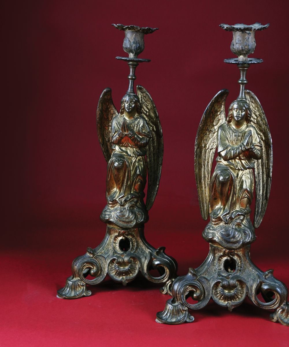 Coppia di candelieri in bronzo dorato cesellati a figura di angelo inginocchiato; tre piedi a voluta, h. cm. 39