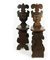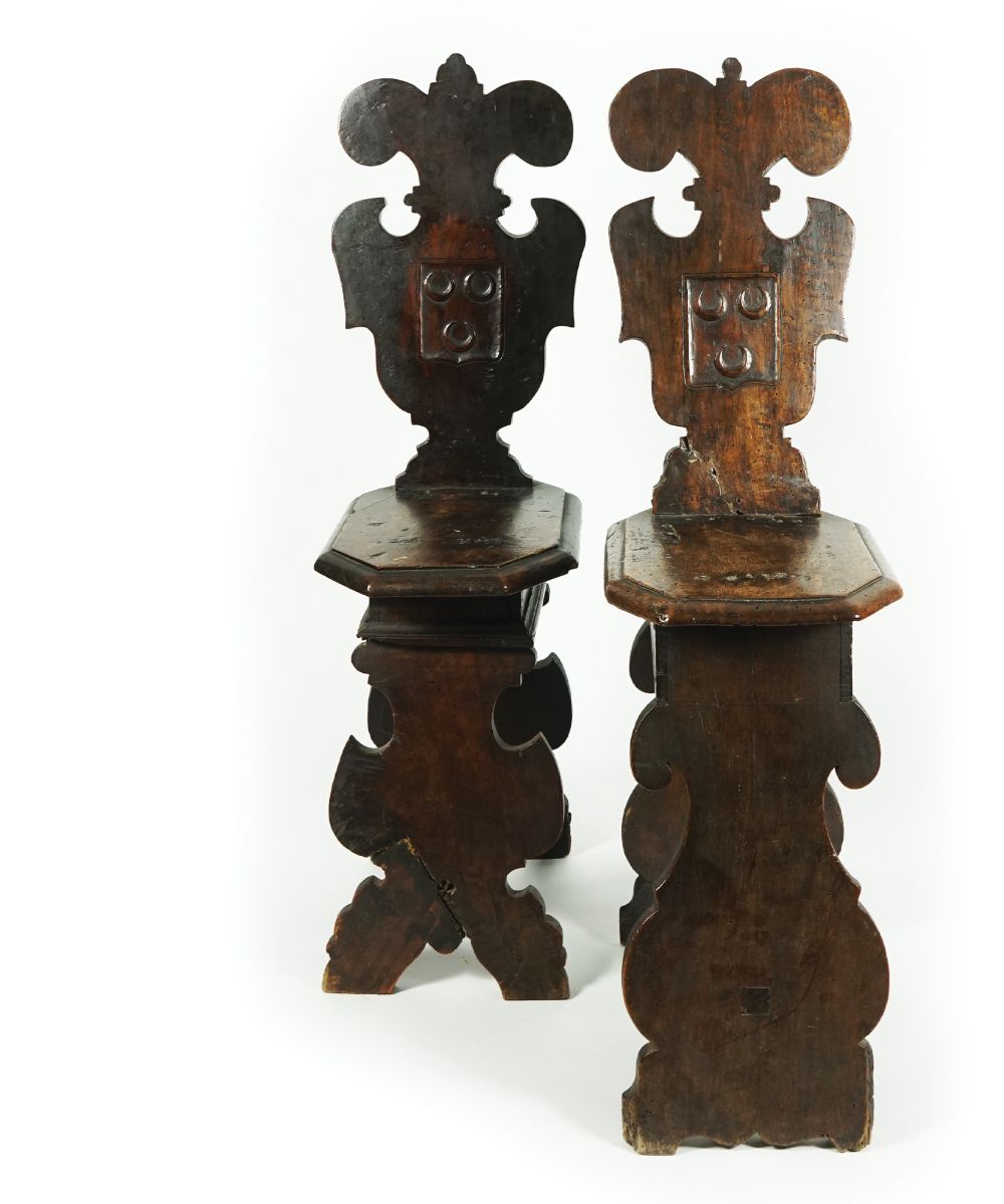 Coppia di sgabelli di noce con profilo del dossello intagliato a volute, centrato dallo stemma dei baroni Mistralis di Brissogne.