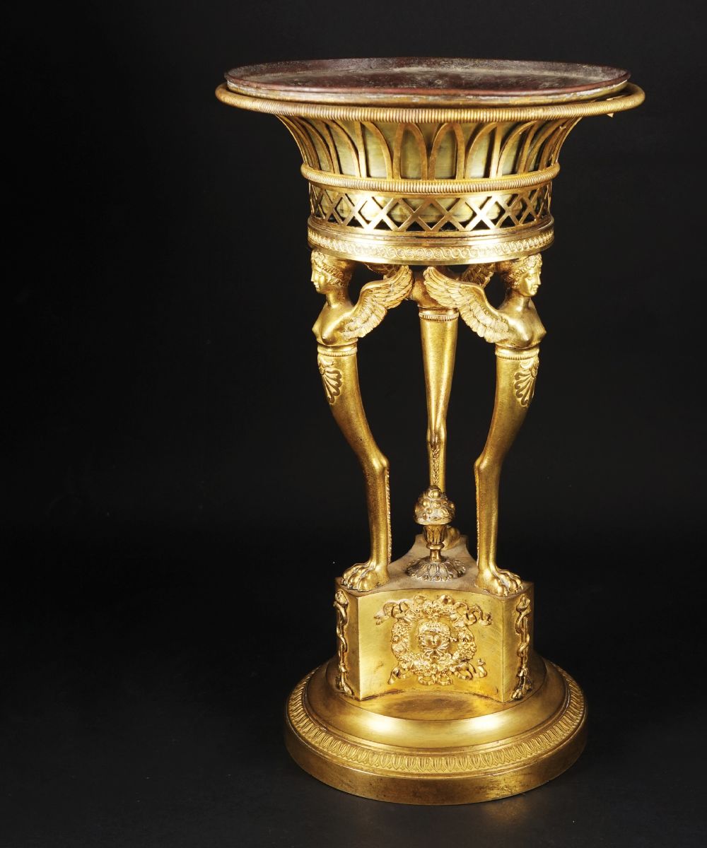 Alzata a tripode in bronzo dorato; recipiente circolare traforato sostenuto da tre cariatidi alate poggianti su base triangolare; piede circolare.