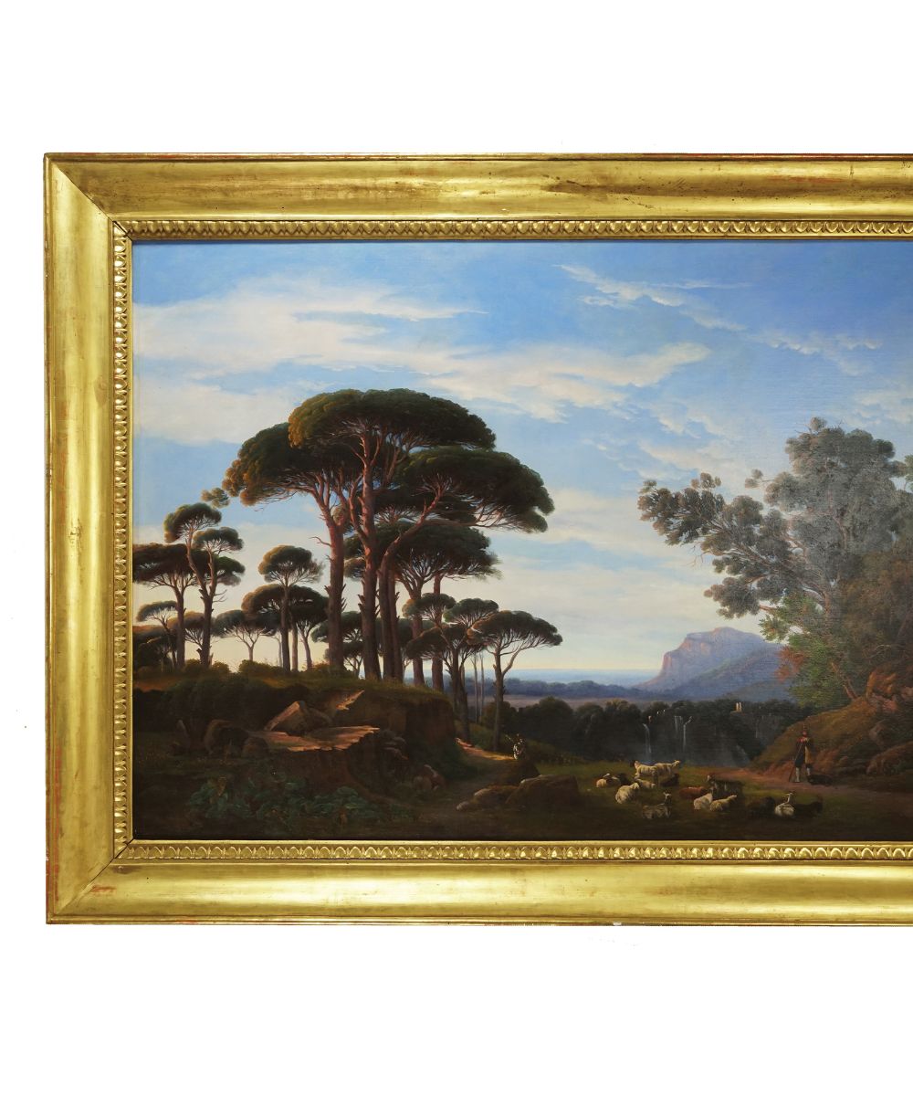 Lot 295 | Pittore romano del XIX secolo Paesaggio al tramonto con pastori, gregge e...