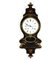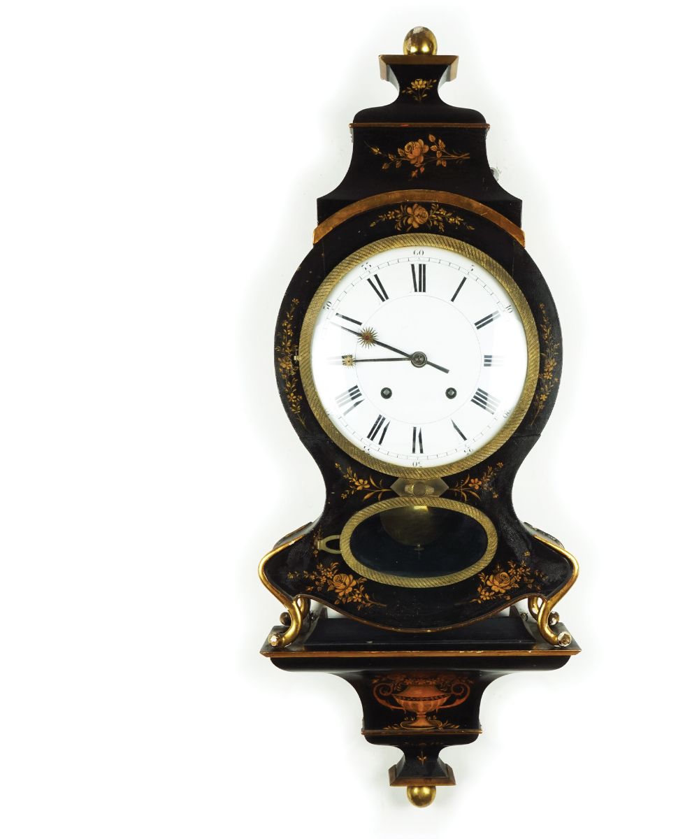Pendola à cartel in legno laccato nero dipinto a dorature a motivi floreali. Cassa centinata con quadrante circolare in smalto bianco con indici in numeri romani.