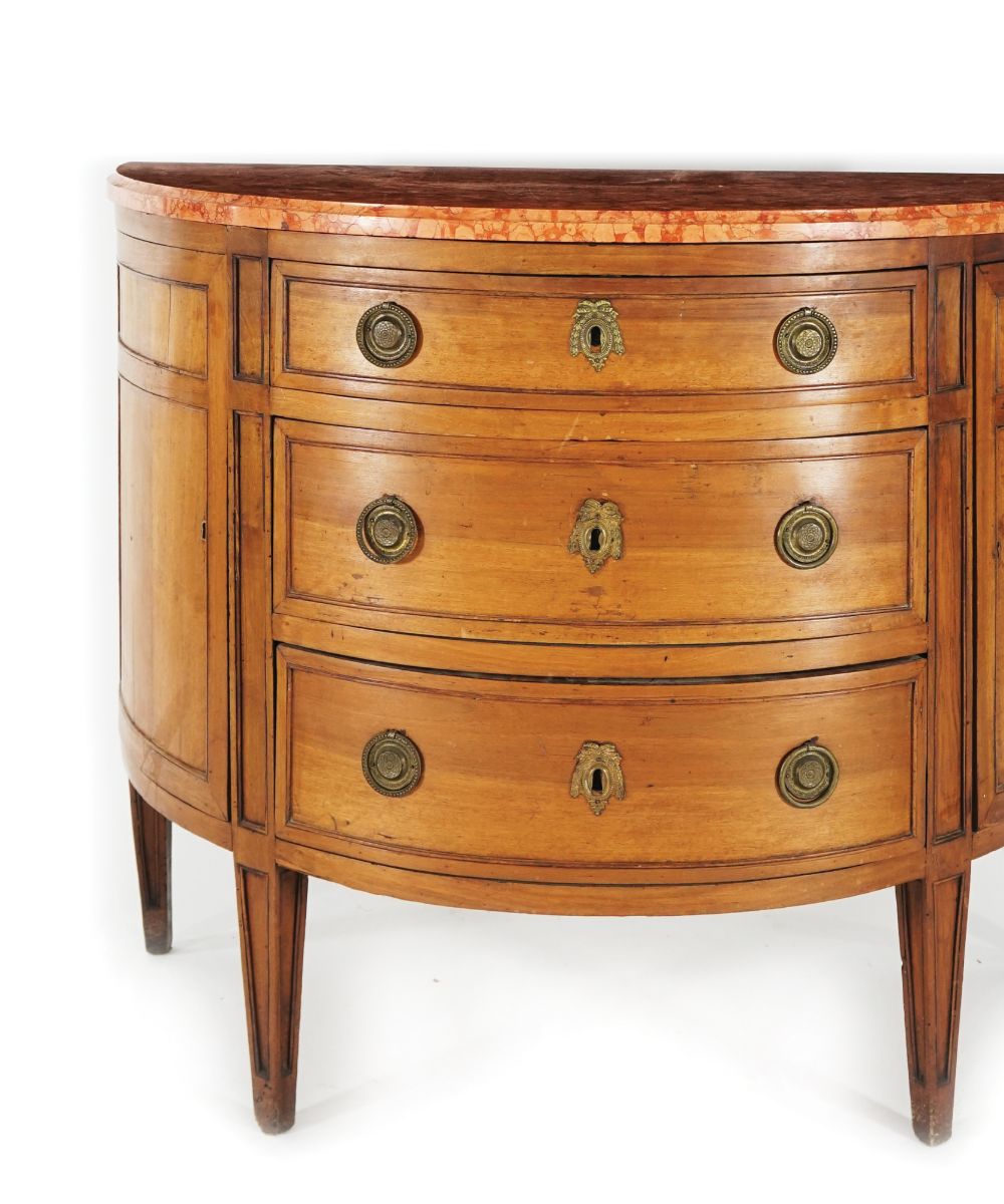 Commode a mezzaluna di noce. Prospetto guarnito di tre cassetti dai profili scorniciati delimitati da due portine; gambe a obelisco; piano in marmo rosso di Verona.