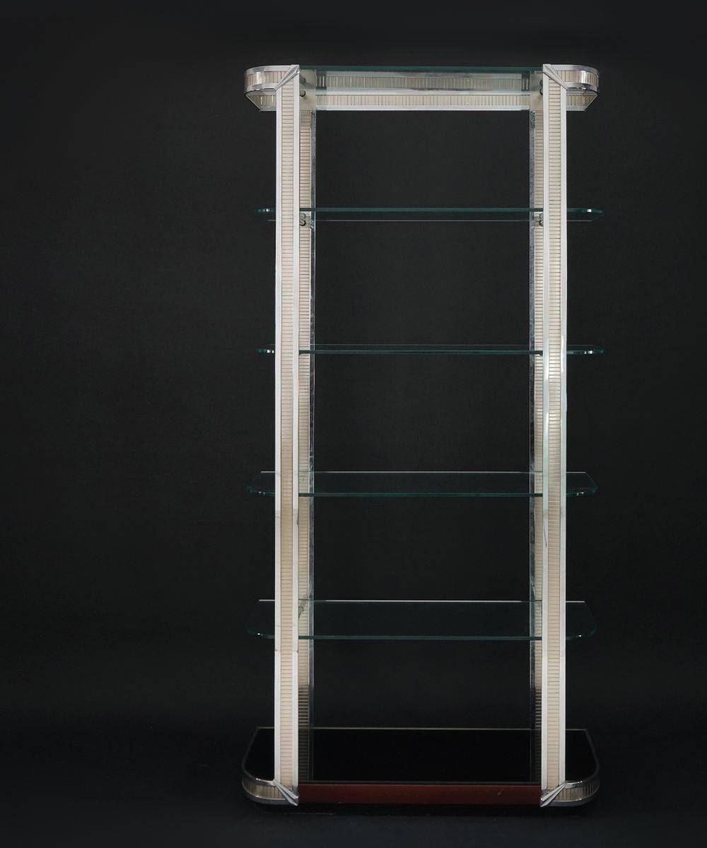 Libreria in metallo con ripiani in vetro; montanti scanalati e dettagli di linea Déco in acciaio; base in mogano, cm. 195x100x40.