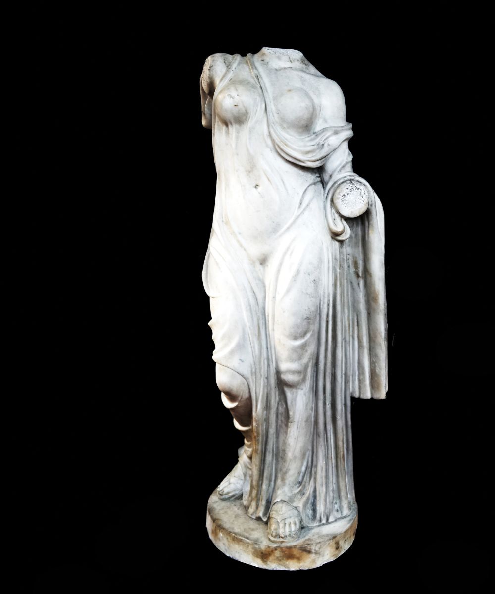 Scultura in marmo bianco raffigurante una figura femminile panneggiata acefala, cm. 123x42x27