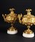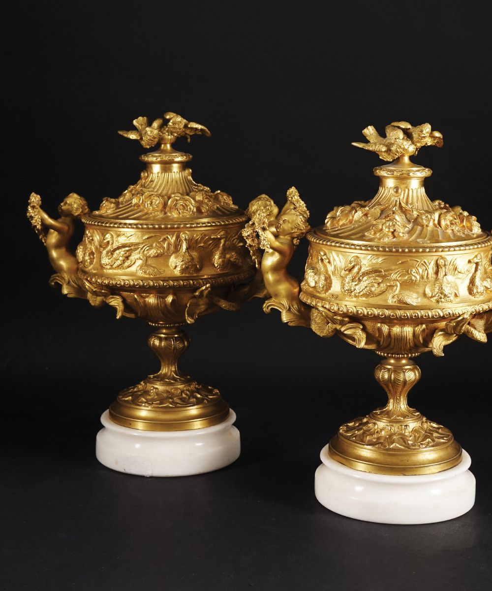 Coppia di coppe con coperchio in bronzo dorato e finemente cesellato a raffigurare sul corpo circolare cigni in uno stagno; due anse in forma di giovane tritone che tiene una ghirlanda; due colombi fungono da presa del coperchio; piede circolare su base di marmo bianco.