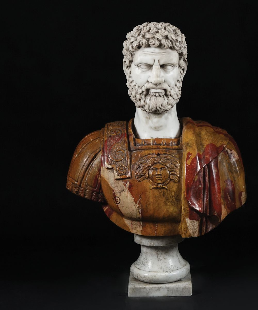 Antica scultura in marmo bianco e diaspro di Sicilia raffigurante il busto di un imperatore romano, h. cm. 63