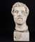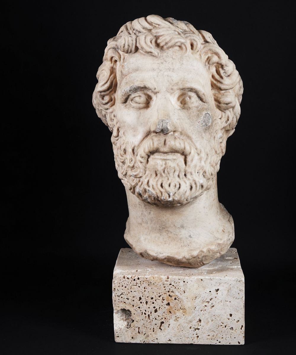 Scultura in marmo bianco raffigurante la testa di Antonino Pio; base in travertino.