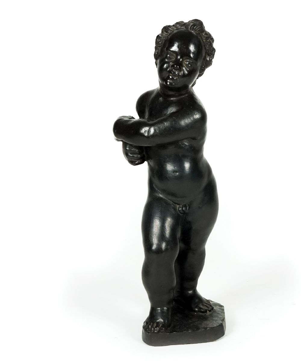 Scultura in marmo patinato raffigurante un putto. Sotto la base reca...