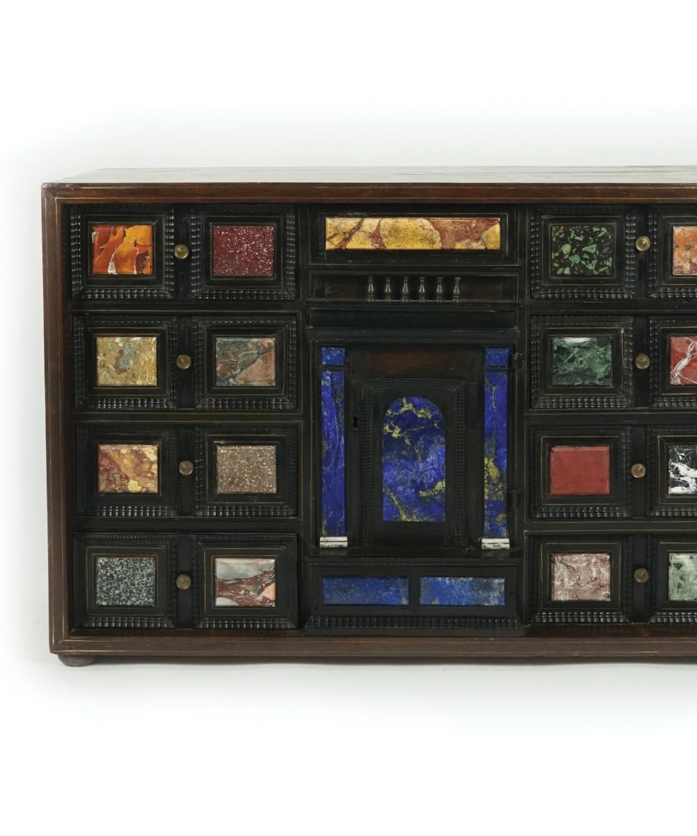 Stipo di forma parallelepipeda lastronato in noce. Prospetto in legno ebanizzato di impronta architettonica, caratterizzato da nove tiretti e una portina centrale decorati da placche in marmi policromi fra i quali spiccano il serpentino verde, il lapislazzuli, il porfido e il rosso antico.
