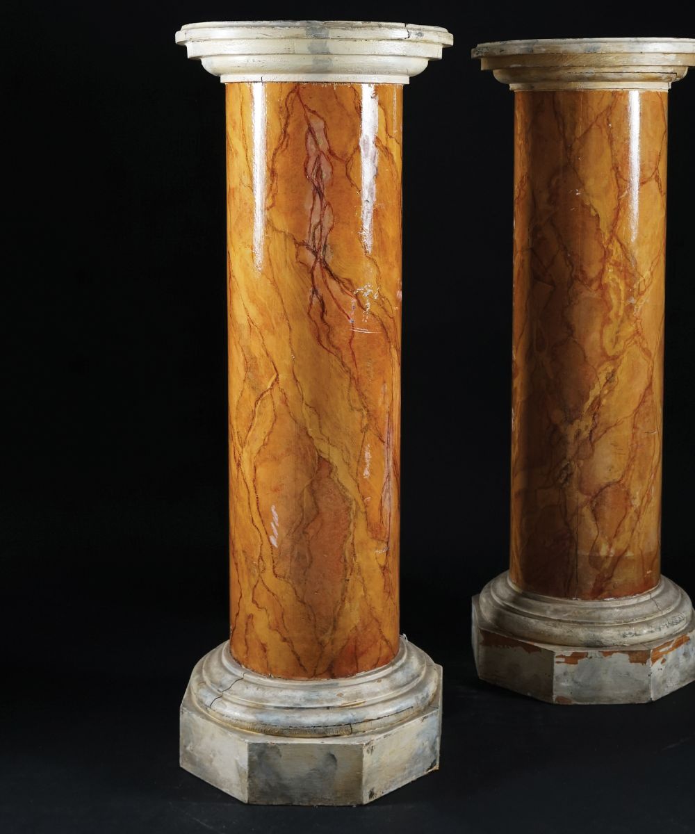 Coppia di basi a colonna in legno laccato e dipinto a finto marmo; piede...
