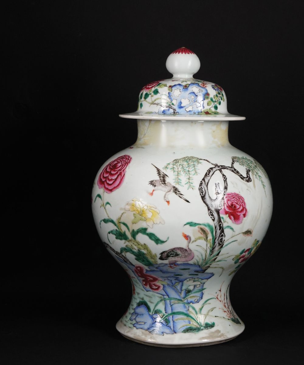 Potiche con coperchio in porcellana bianca e policroma. Corpo globulare dipinto a raffigurare un paesaggio lacustre con pesci, rami di peonie e volatili; coperchio a cupolino con presa a bocciolo.