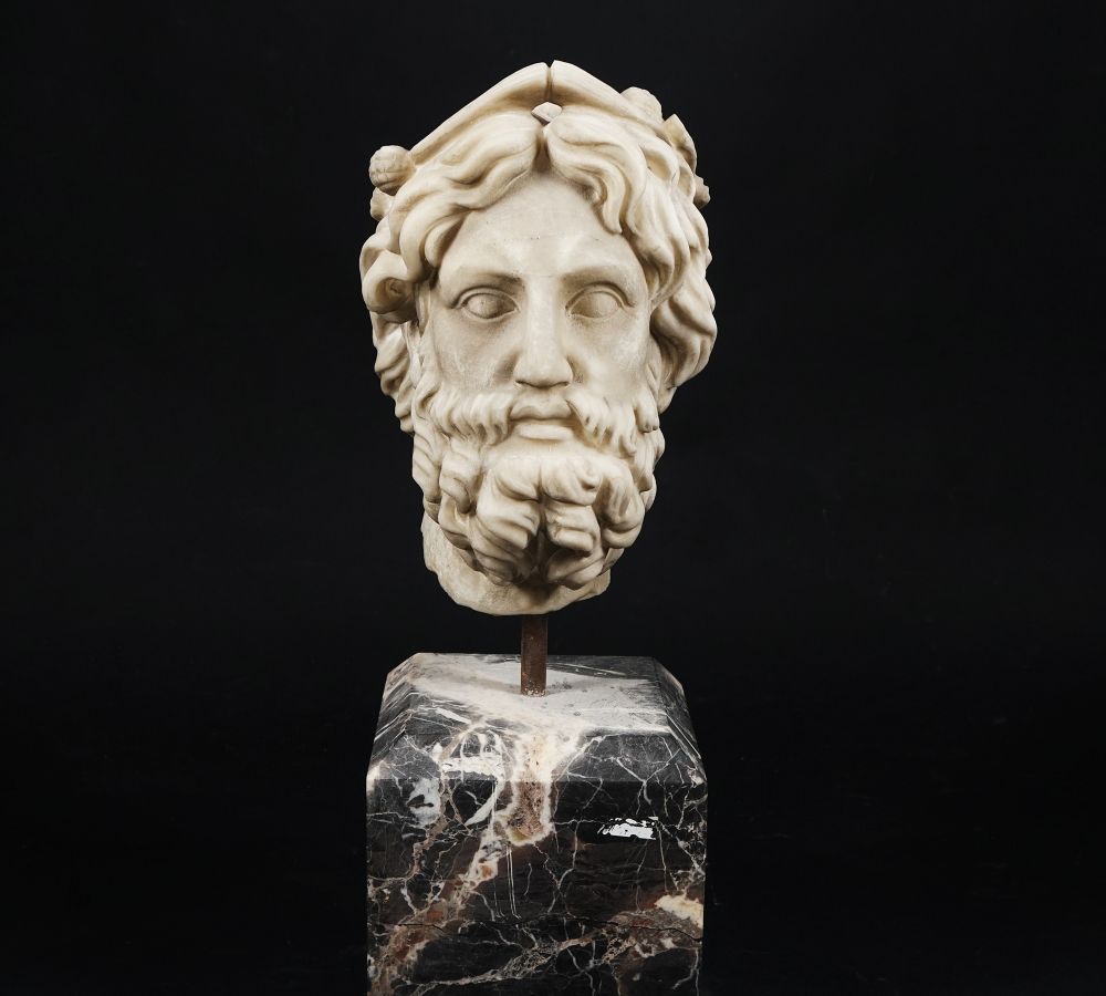 Scultura in marmo bianco raffigurante una testa virile barbuta; base in bianco e nero d'Aquitania, la testa h. cm. 30; complessivamente h. cm. 60