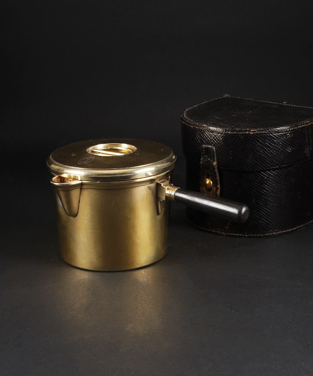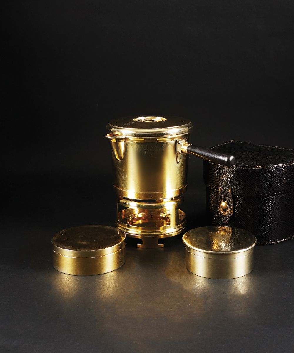 Cioccolatiera da viaggio in argento dorato a superficie liscia smontabile in più parti; manico ligneo. In custodia originale di pelle.