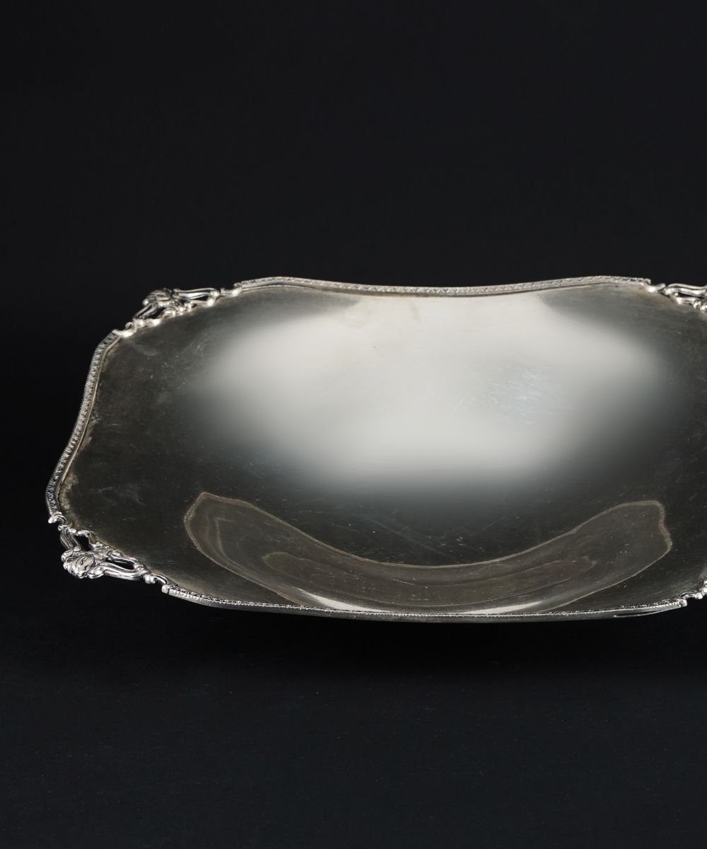 Centrotavola in argento a superficie liscia di forma rettangolare con angoli cesellati a giorno, cm. 25x22, peso gr. 386