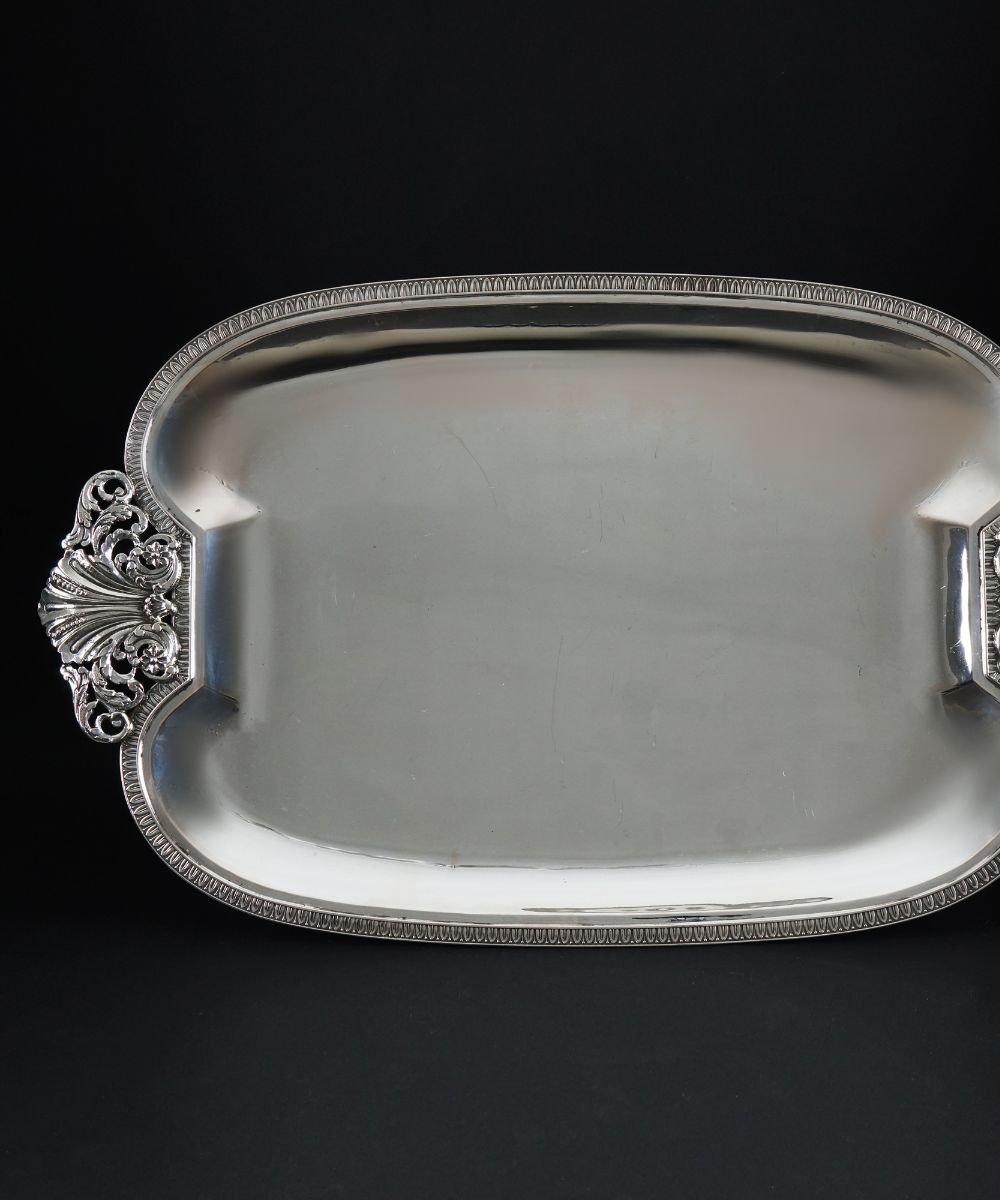Vassoio in argento di forma ovale con profilo del bordo cesellato a palmette; prese a cespo di volute fogliate.