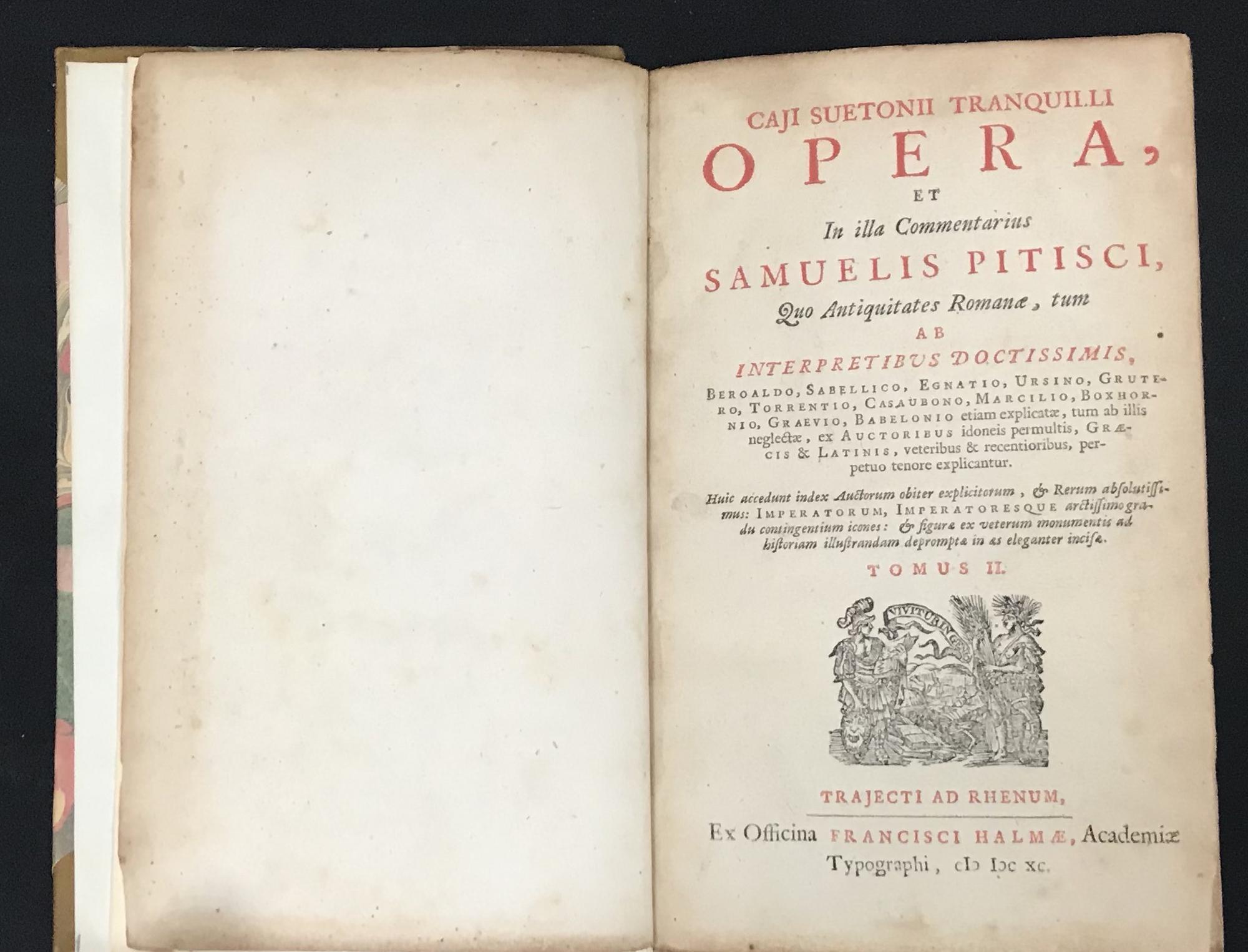 CAJI SUETONII TRANQUILLI OPERA, et In illa Commentarius Samuelis Pitisci, Quo Antiquitates Romanae, tum ab interpretibus doctissimis, Beroaldo, Sabellico, Egnatio, Ursino, Grutero, Torrentio, Casaubono, Marcilio, Boxhornio, Graevio, Babelonio etiam explcatea, tum ab illis neglegtae, ex Auctoribus idoneis permultis, Graecis & Latinis, veteribus & recentioribus, perpetuo tenore explicantur, Huic accedunt index Auctorum obiter explicitorum, & Rerum absolutissimus: Imperatorum, Imperatoresque arctissimo gradu contingentium icones : & figurae ex veterum monumentis ad historiam illustrandam depromptae in as eleganter incisa. Trajecti ad Rhenum Ex Officina Francisci Halmae, 1690