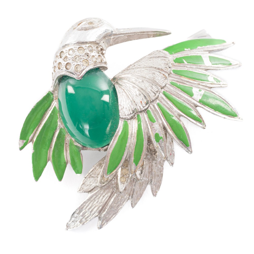 Spilla Cardin a forma di uccello con smalti e pietra verde cabochon. Usure nello smalto.