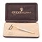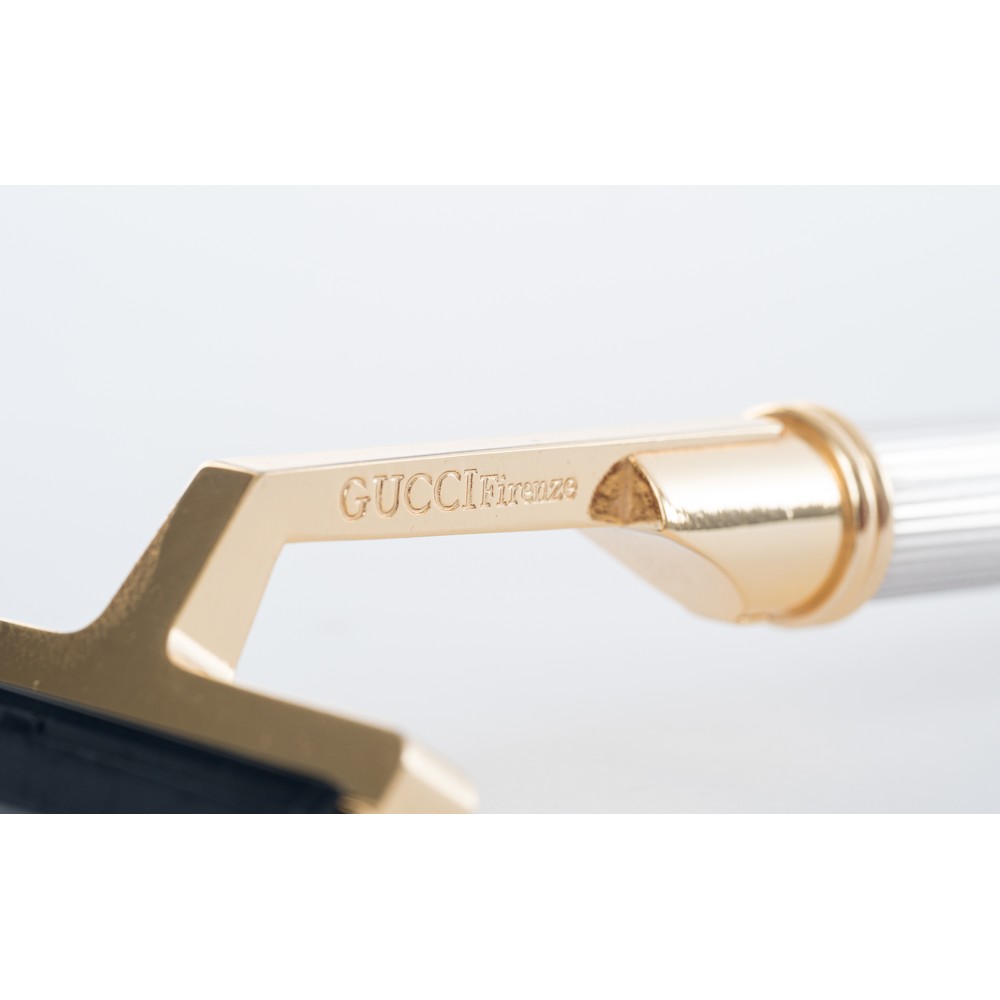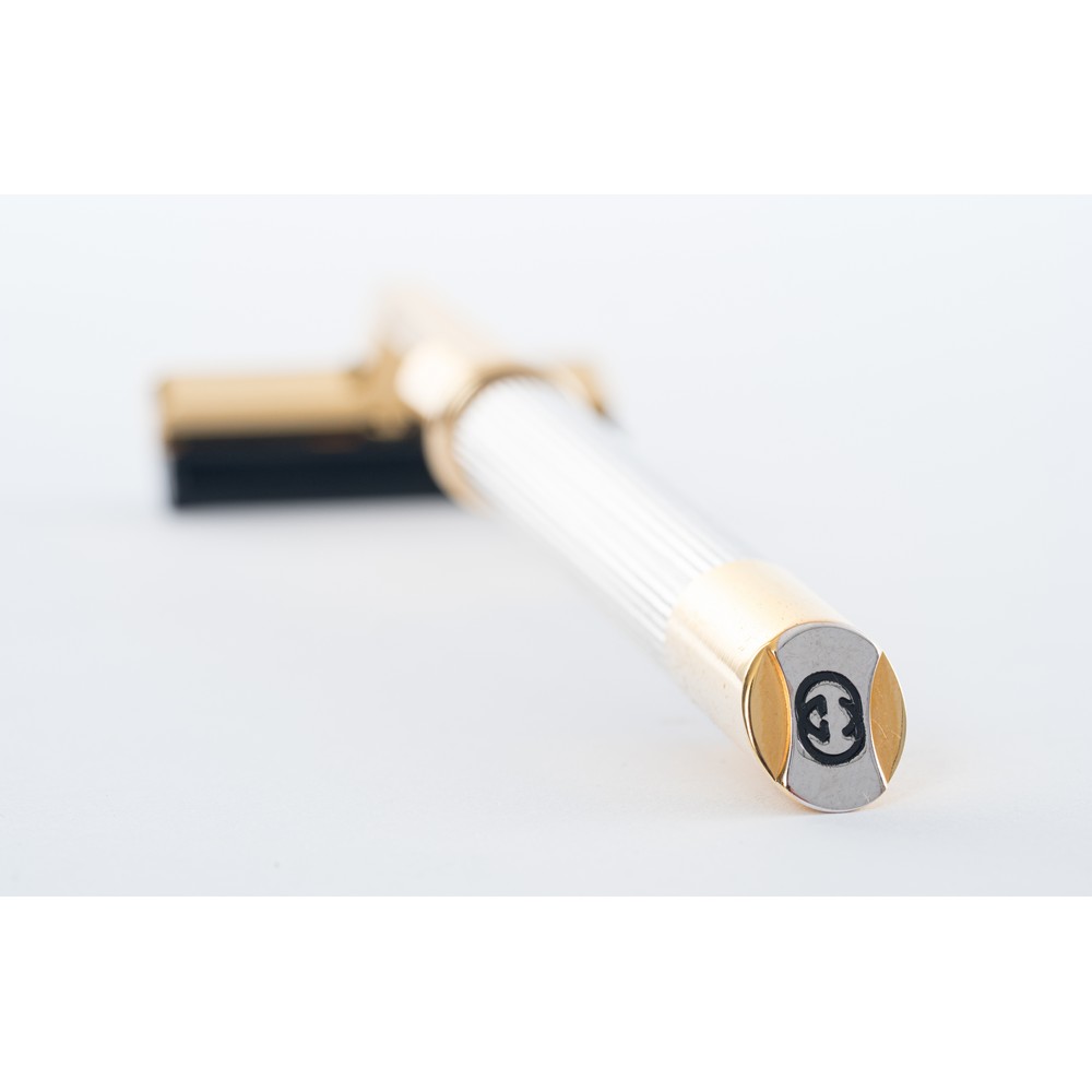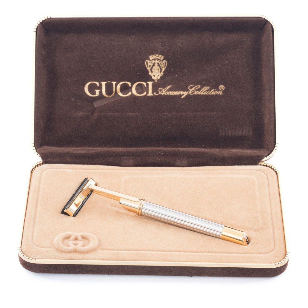 Rasoio a mano Gucci con manico a costolature argento e rifiniture dorate, nuovo con scatola.