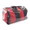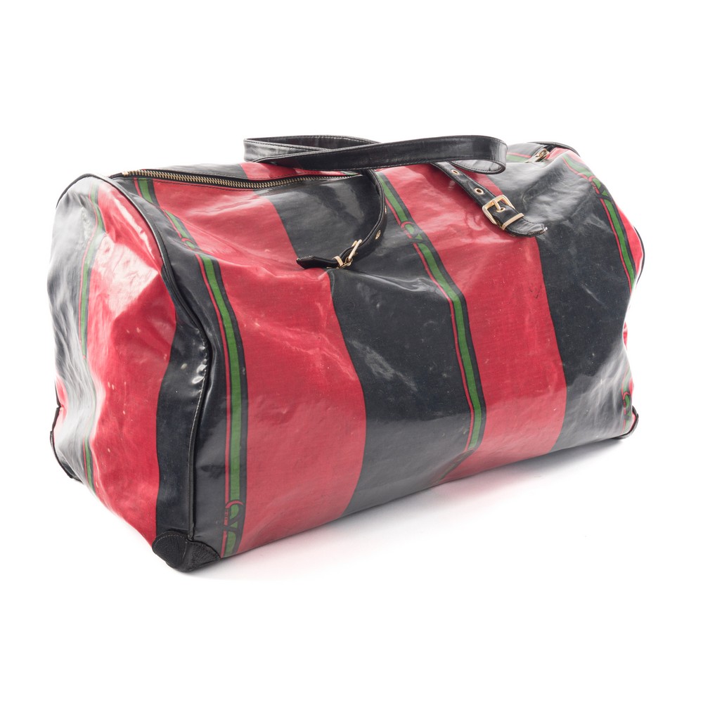 Borsone Di Camerino in tessuto cerato a righe rosso e blu con logo, e manici con fibbie.