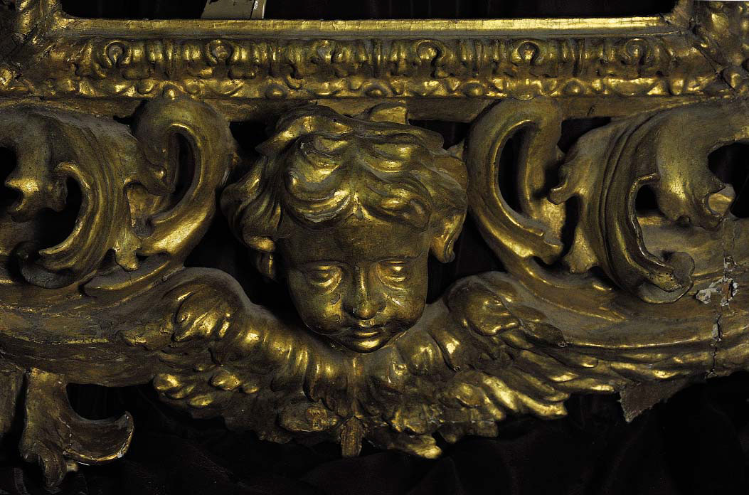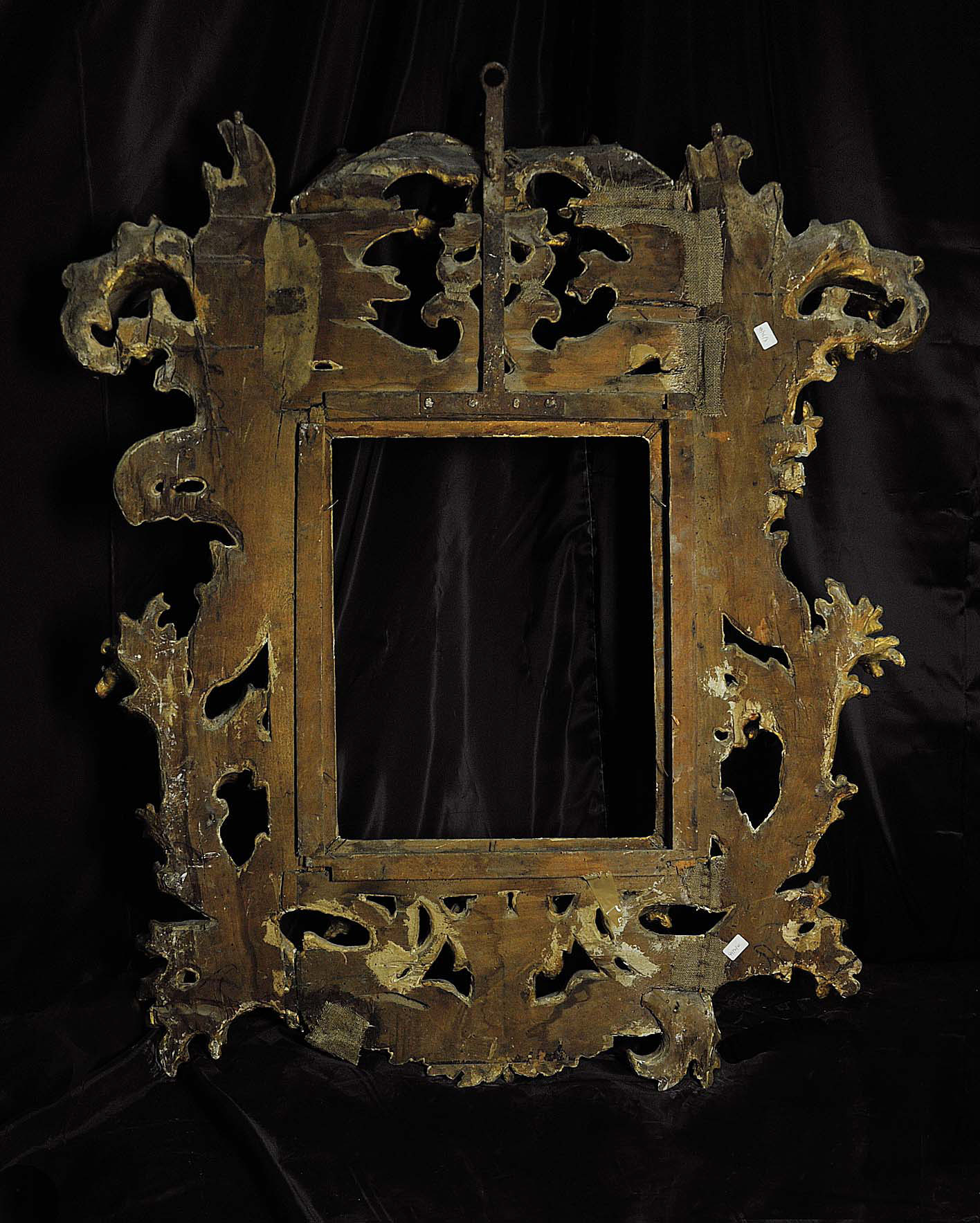 IMPORTANTE CORNICE BAROCCA DA SPECCHIERA Roma, 1650-1670 ca. Legno intagliato e dorato 110x93x17 cm. Stato di conservazione Superficie: 50% (perdita della doratura) Struttura: 50% (fratture e mancanze in più punti; restauri a colla e stoffa)