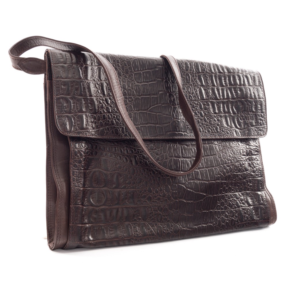 Busta Coveri in pelle stampa coccodrillo con tracolla. Colore marrone bruciato.