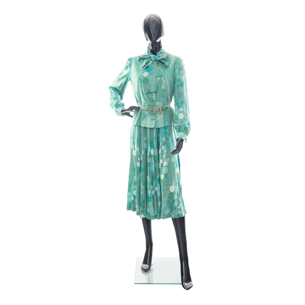 Completo vintage Riva in pura seta con cintura in vita a motivi floreali su fondo verde.