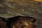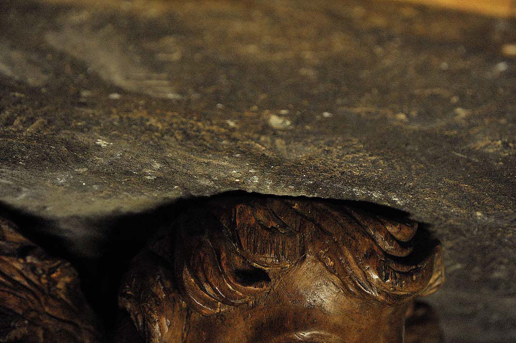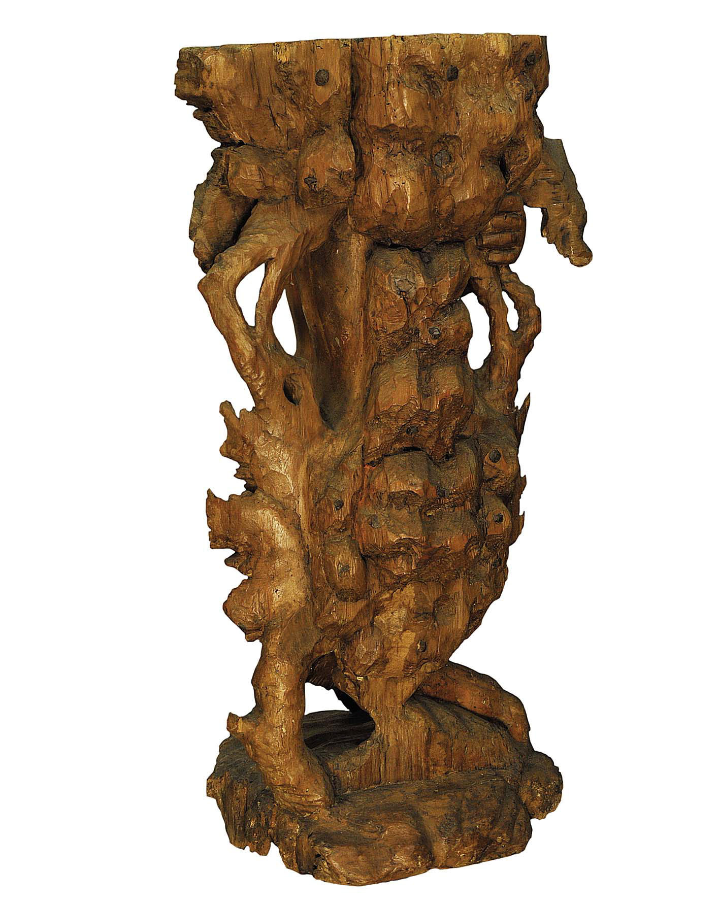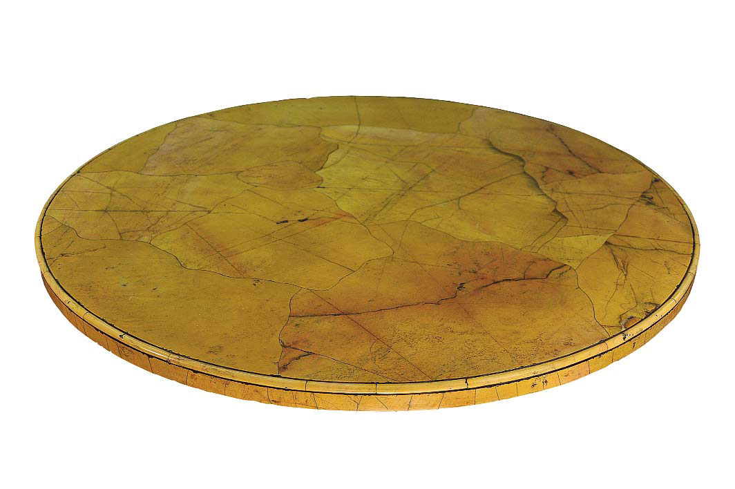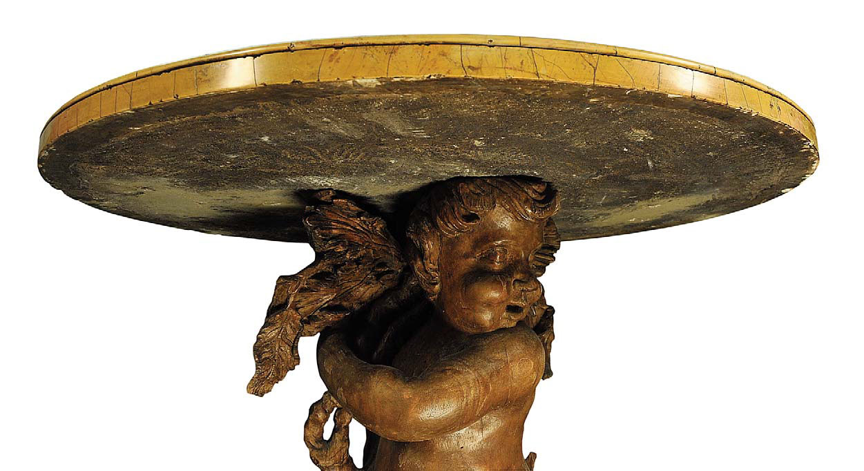 TAVOLO SORRETTO DA SATIRO Produzione romana, 1660-1680 ca. (?) Base in legno scolpito su un tema berniniano Pianale in marmo giallo applicato ad una base di pietra comune solidificata con cemento 89,5x98,5 cm. Stato di conservazione Superficie: 80% Struttura: 70% (umidità; restauri)