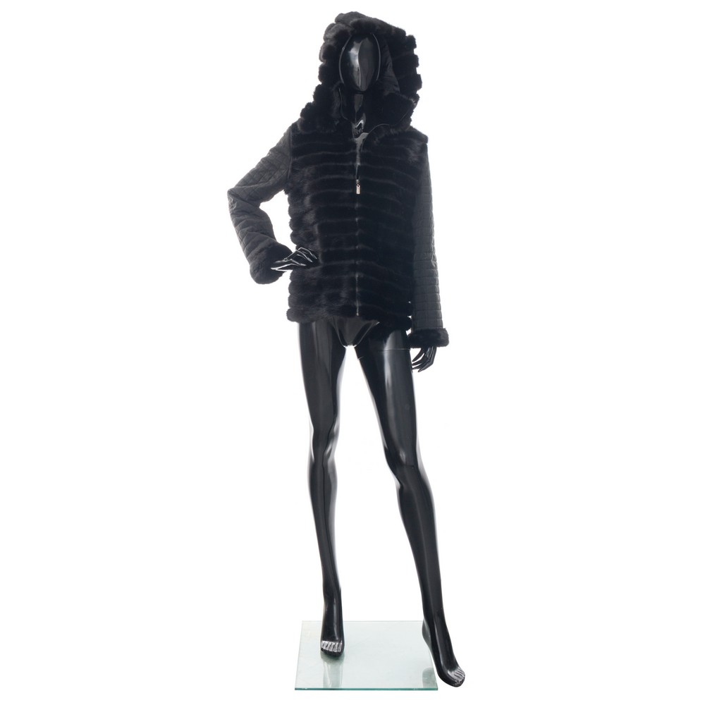 Giacca in visone nero con cappuccio foderato in visone e fodera a pois bianco e nero.