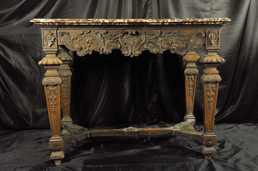CONSOLLE INTAGLIATA IN STILE LUIGI XIV Produzione francese o svizzera, XVIII secolo Noce, marmo rosso di Francia 84,5x109x52,5 cm. Stato di conservazione Superficie: 85% Struttura: 85% (piedi molto rovinati)