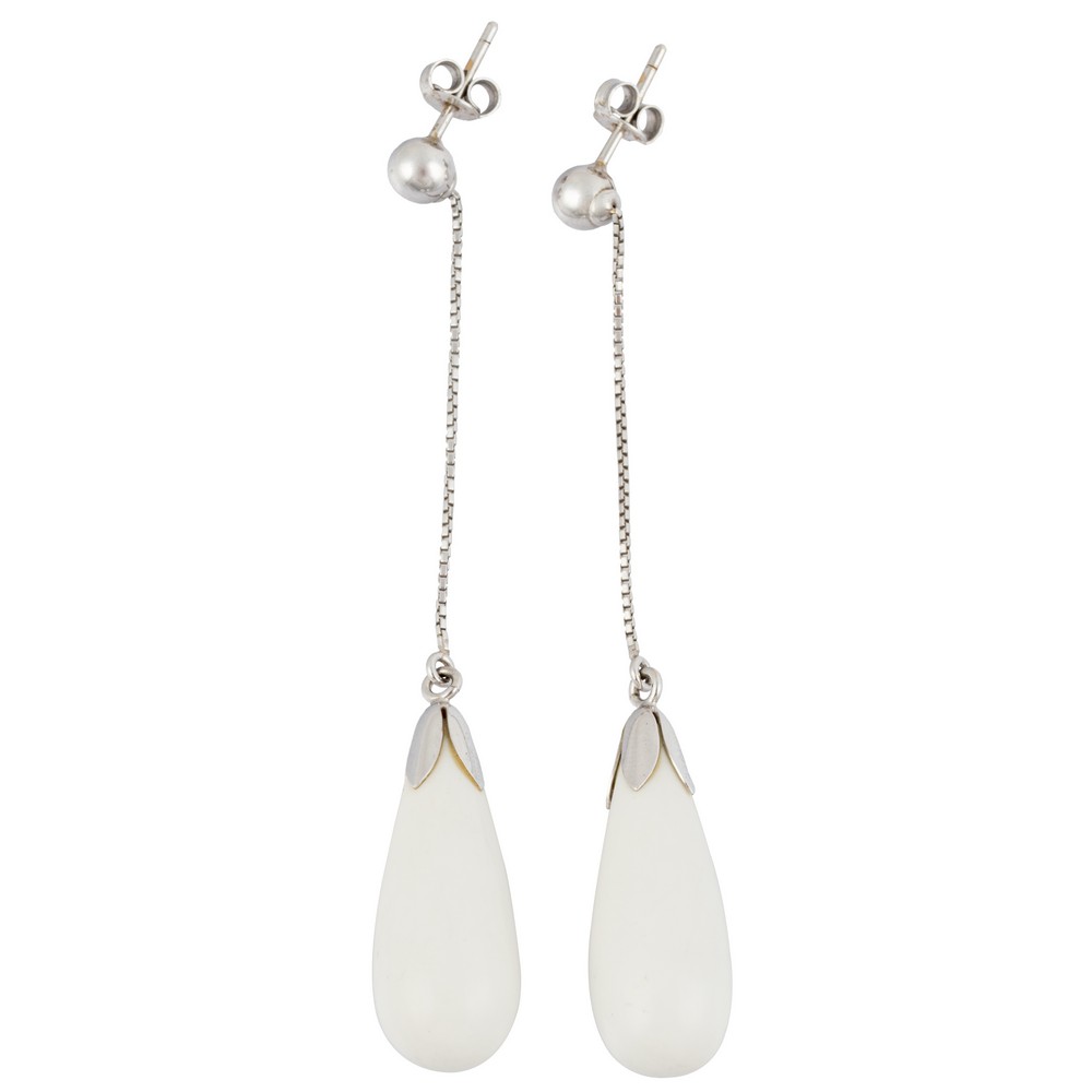 ORECCHINI / PENDENTI in oro bianco 18 KT e gocce in materiale plastico (g. 7,80).