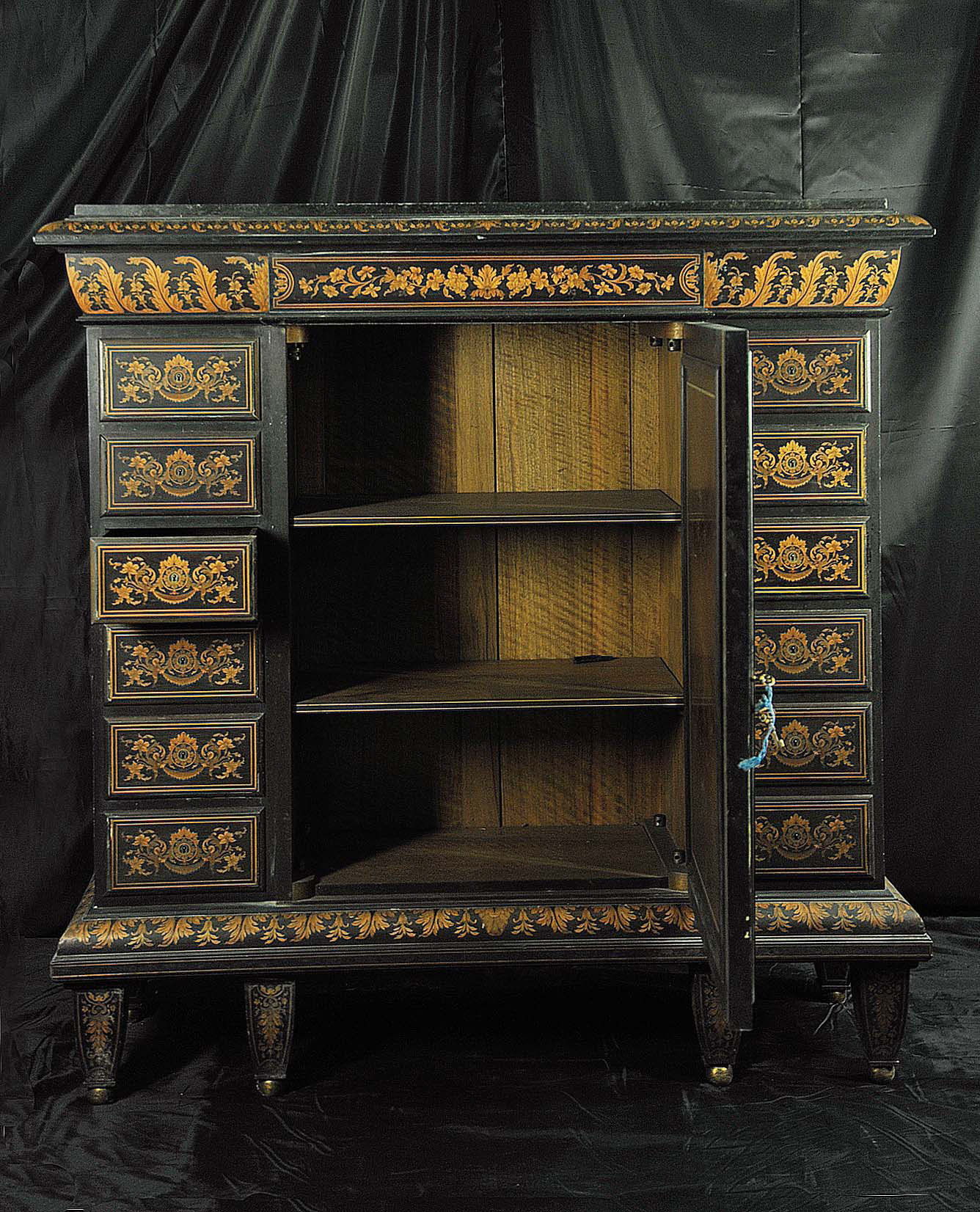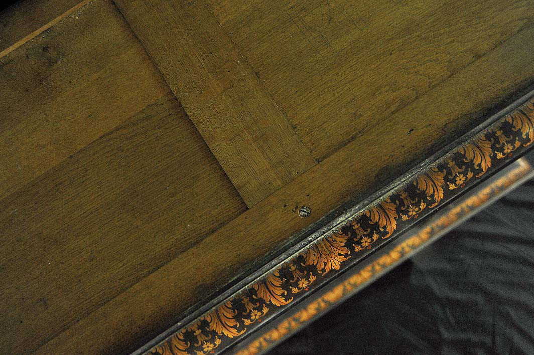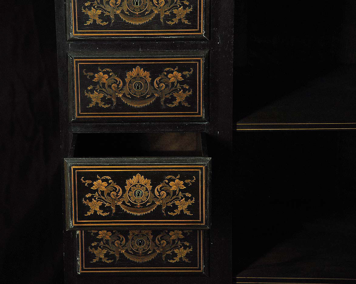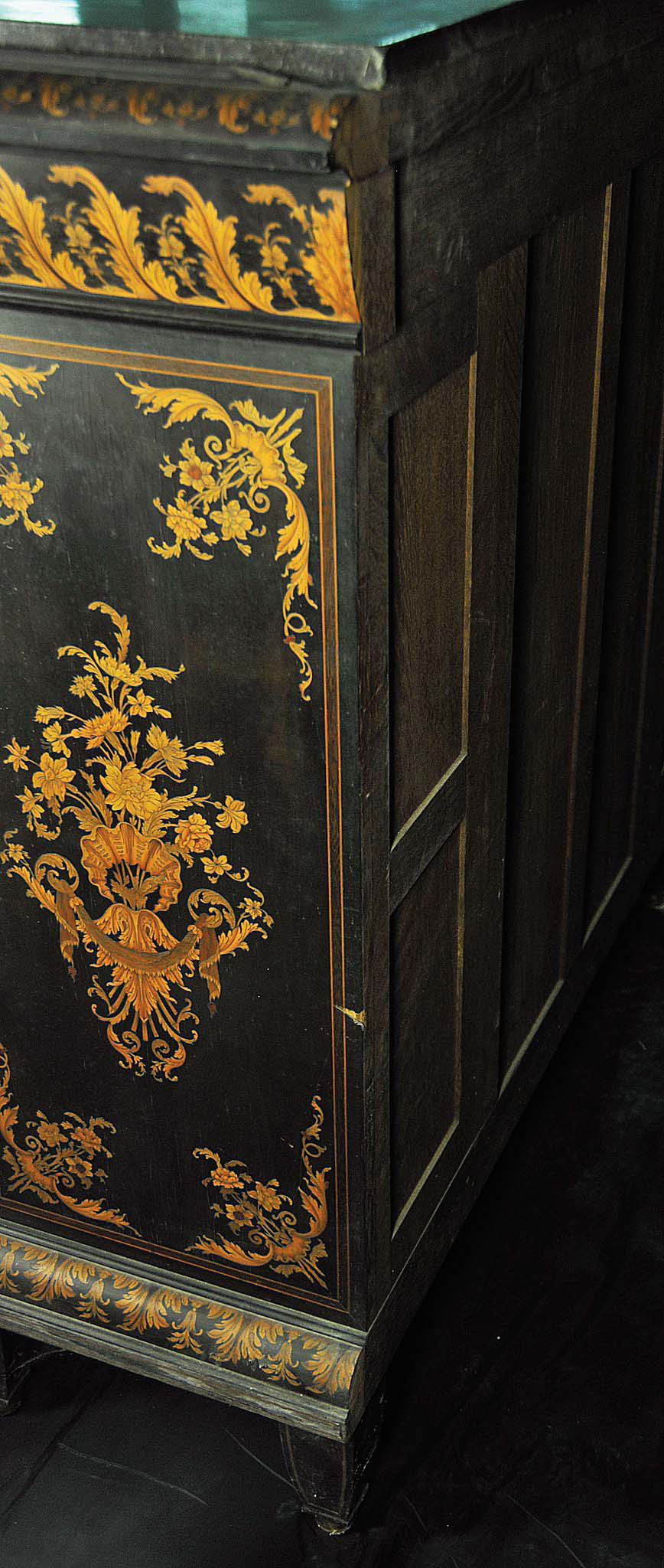 SETTIMINO CON TEMA FLOREALE Produzione olandese, XIX secolo Legno dipinto e intarsiato in acero (?), pietra serena 123x123x45,5 cm. Natura morta floreale ispirata a modelli secenteschi Stato di conservazione Superficie: 90% Struttura: 90%
