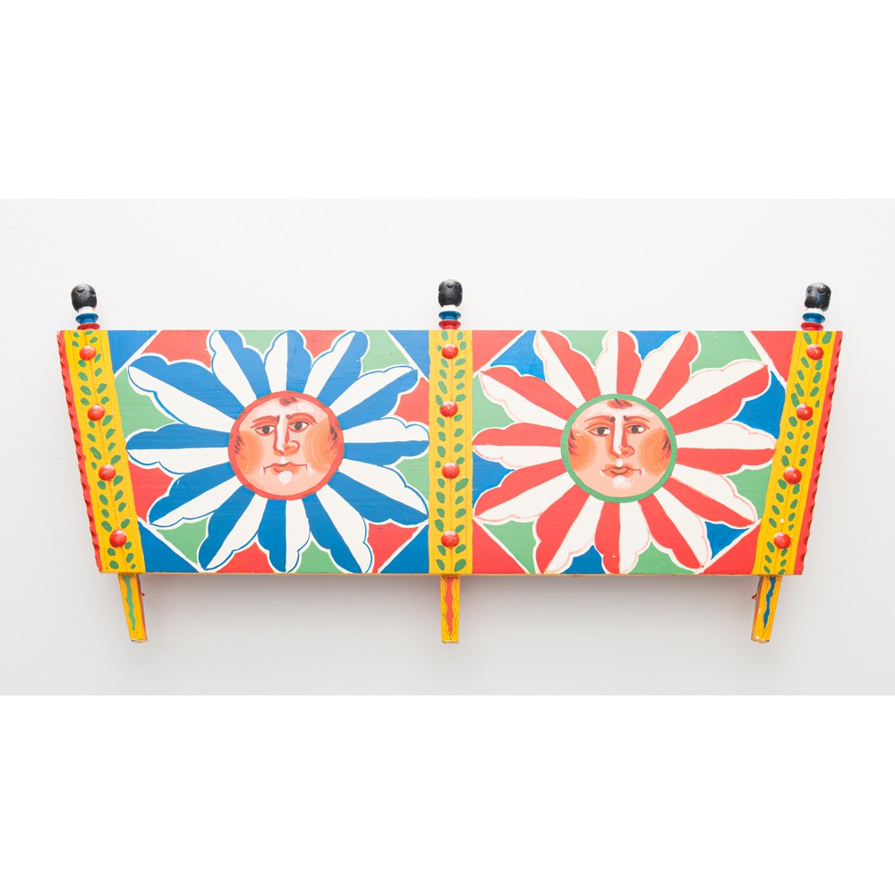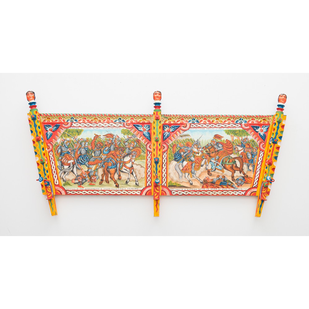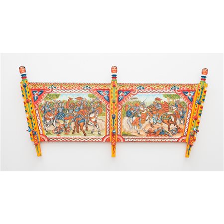 Sponda di carretto in legno dipinto raffigurante "Rinaldo sotto le mura di Montalbano e Battaglia tra Bradamante e Dama Rovenza e Saraceni". XX secolo.