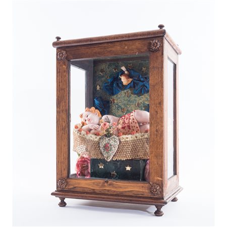 BAMBINELLO in cera entro teca in legno con applicazioni in corallo rosso. Sicilia primi '900.