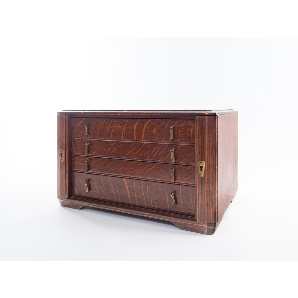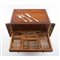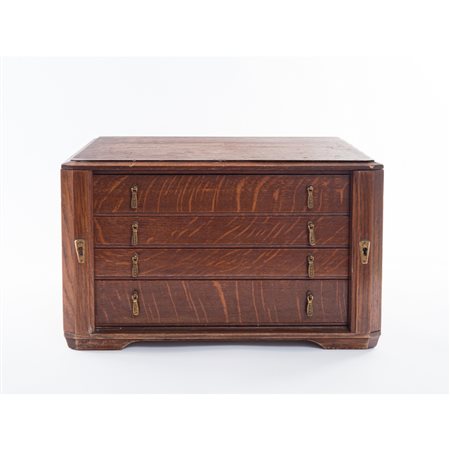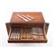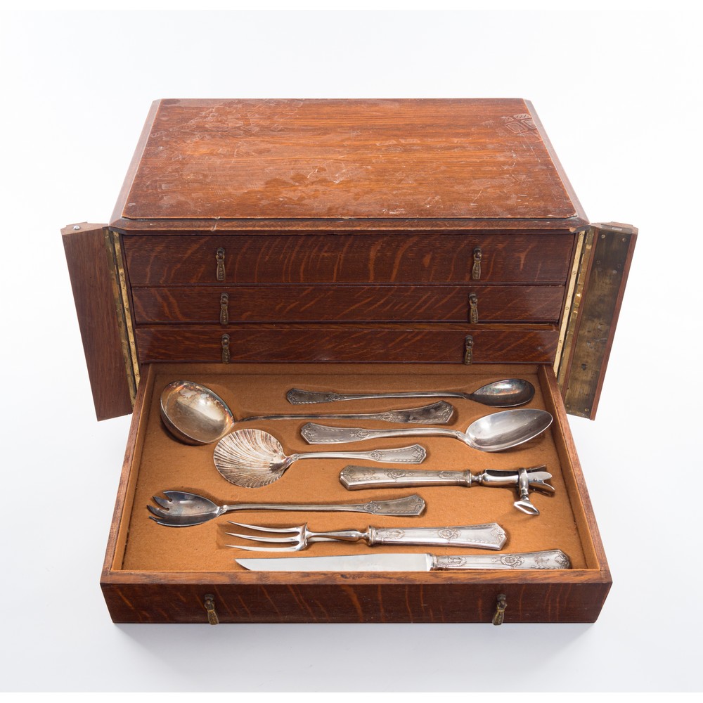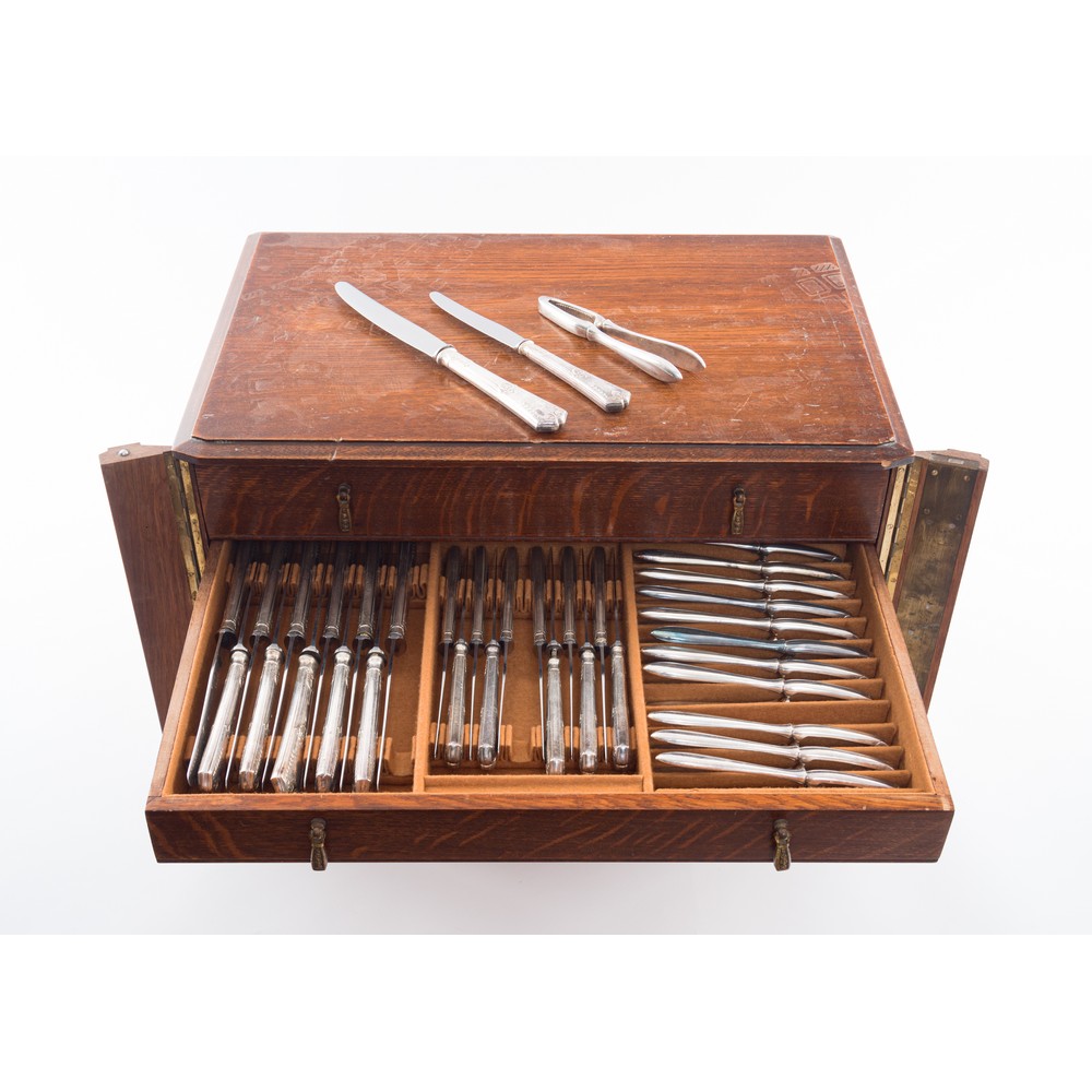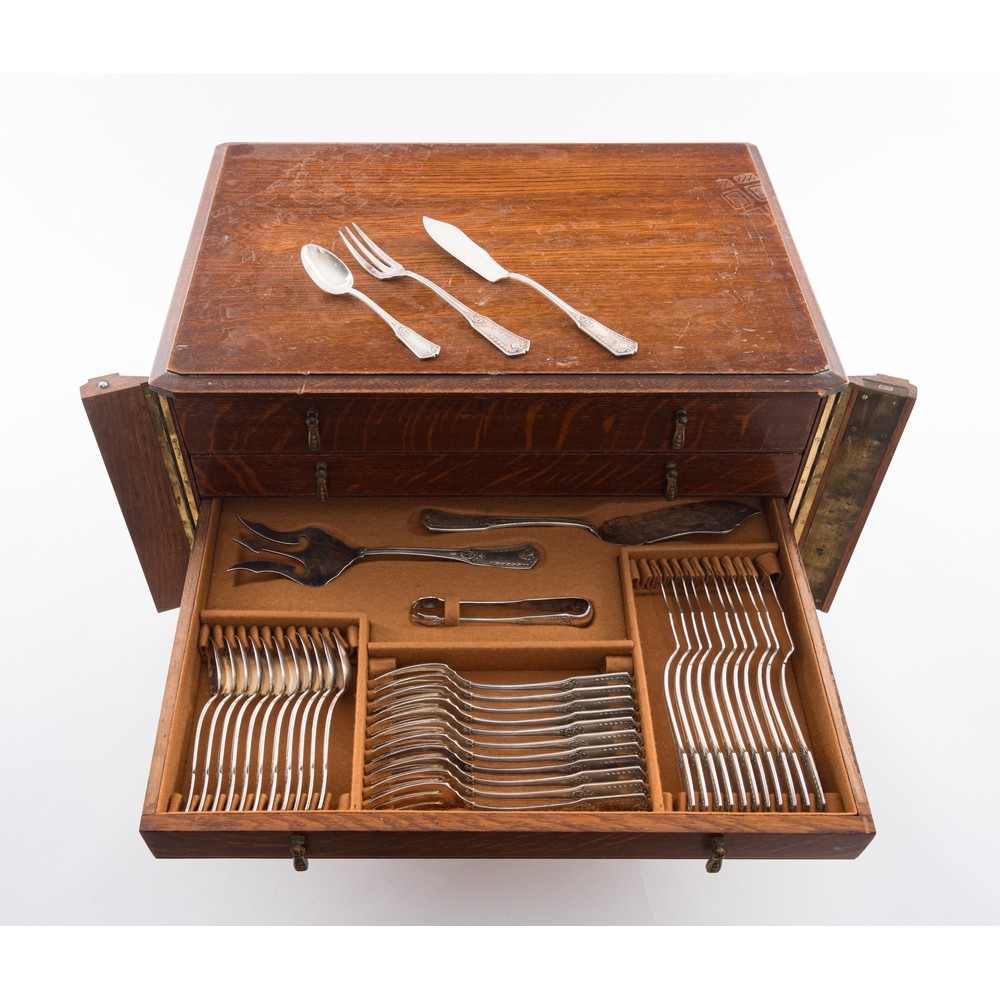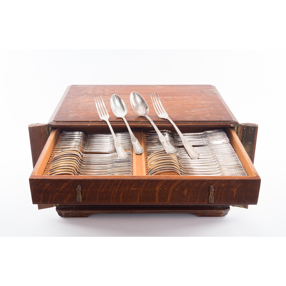 SERVIZIO DI POSATE in metallo argentato entro cassetta contenitore in rovere composto da 12 forchette grandi, 12 cucchiai grandi, 12 coltelli grandi, 12 forchette medie, 12 cucchiai medi, 12 coltelli medi, 12 forchettine, 12 cucchiaini, 12 coltelli pesce, 12 schiaccianoci e 11 accessori da portata. XX secolo.