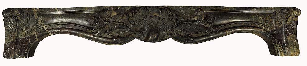 RIVESTIMENTO PER CAMINO SUL TEMA DEL FOCOLARE DOMESTICO Produzione italiana (?), XX secolo Marmi indiano (?) e ghisa Parti in marmo Due pilastri: ognuno 84,5x17,5x12,6 cm. Pianale: 2,4x106x20,3 cm. Parti in ghisa Due pannelli laterali: ognuno 88,5x47,3 cm. Pannello centrale: 88,5x77,5 cm. Due coppi: ognuno: 88,8x22 Stato di conservazione Superficie: 100% Struttura: 100%