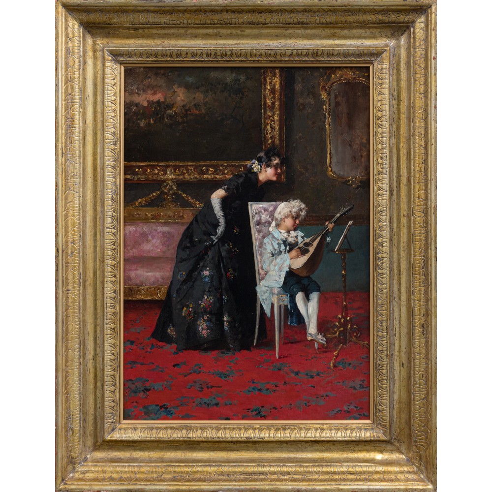 Scena di interno di vita a palazzo con giovane nobiluomo a lezione di mandolino