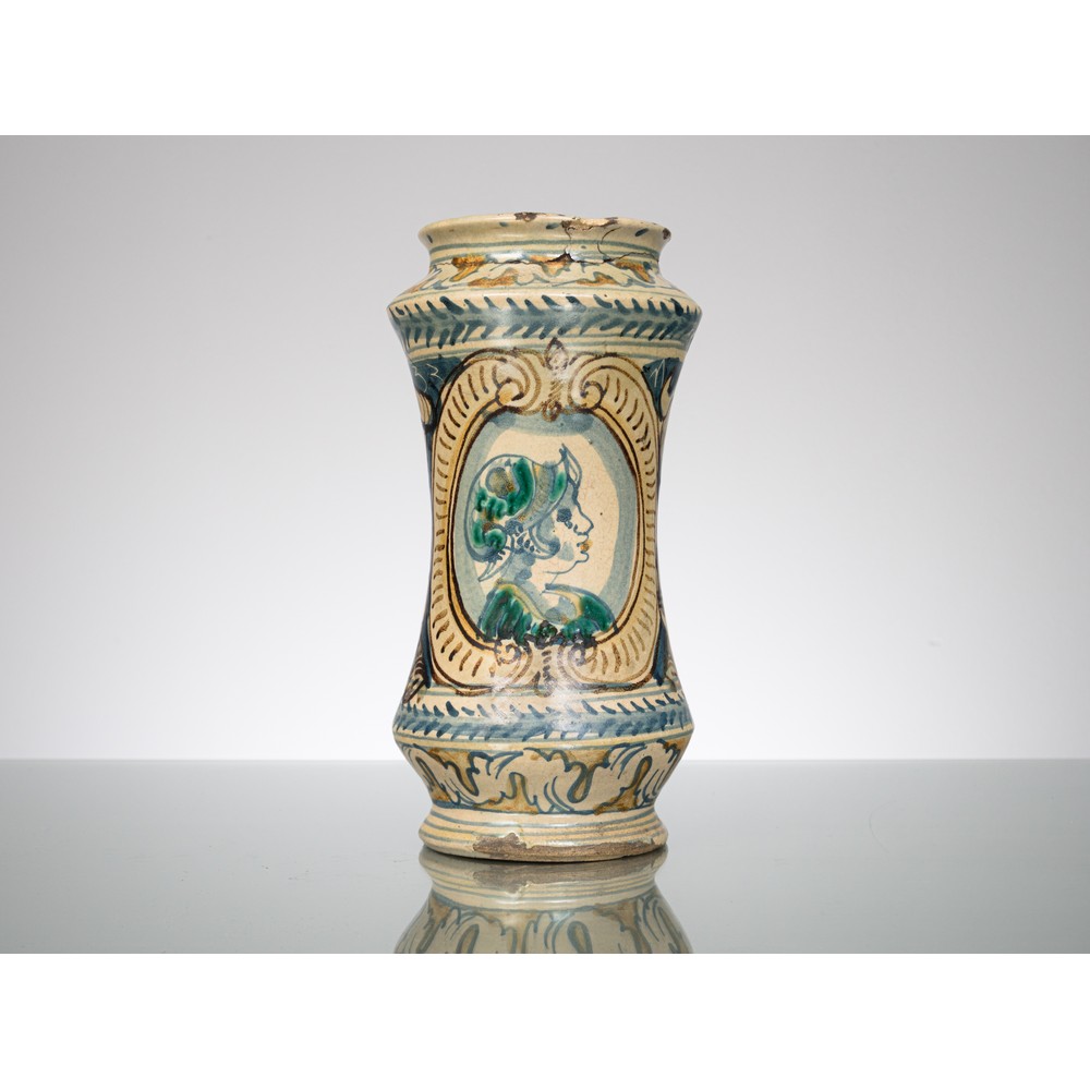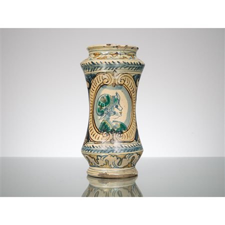 Albarello in maiolica policroma con profilo entro medaglione.