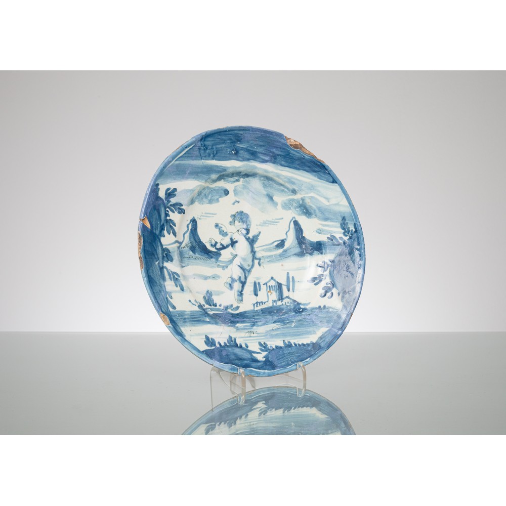 Piatto in maiolica policroma smaltata e decorata con putto alato e paesaggio (difetti e restauri).