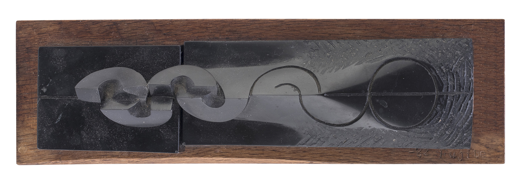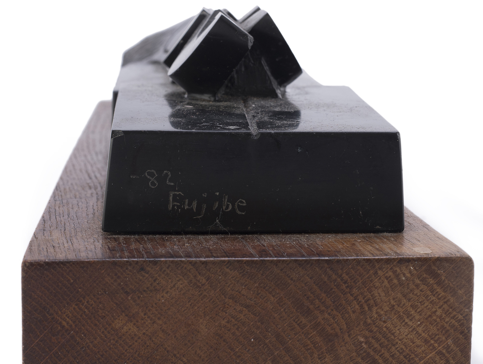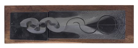 Scultura in marmo nero e legno di rovere, cm. 14 x 46 x 14