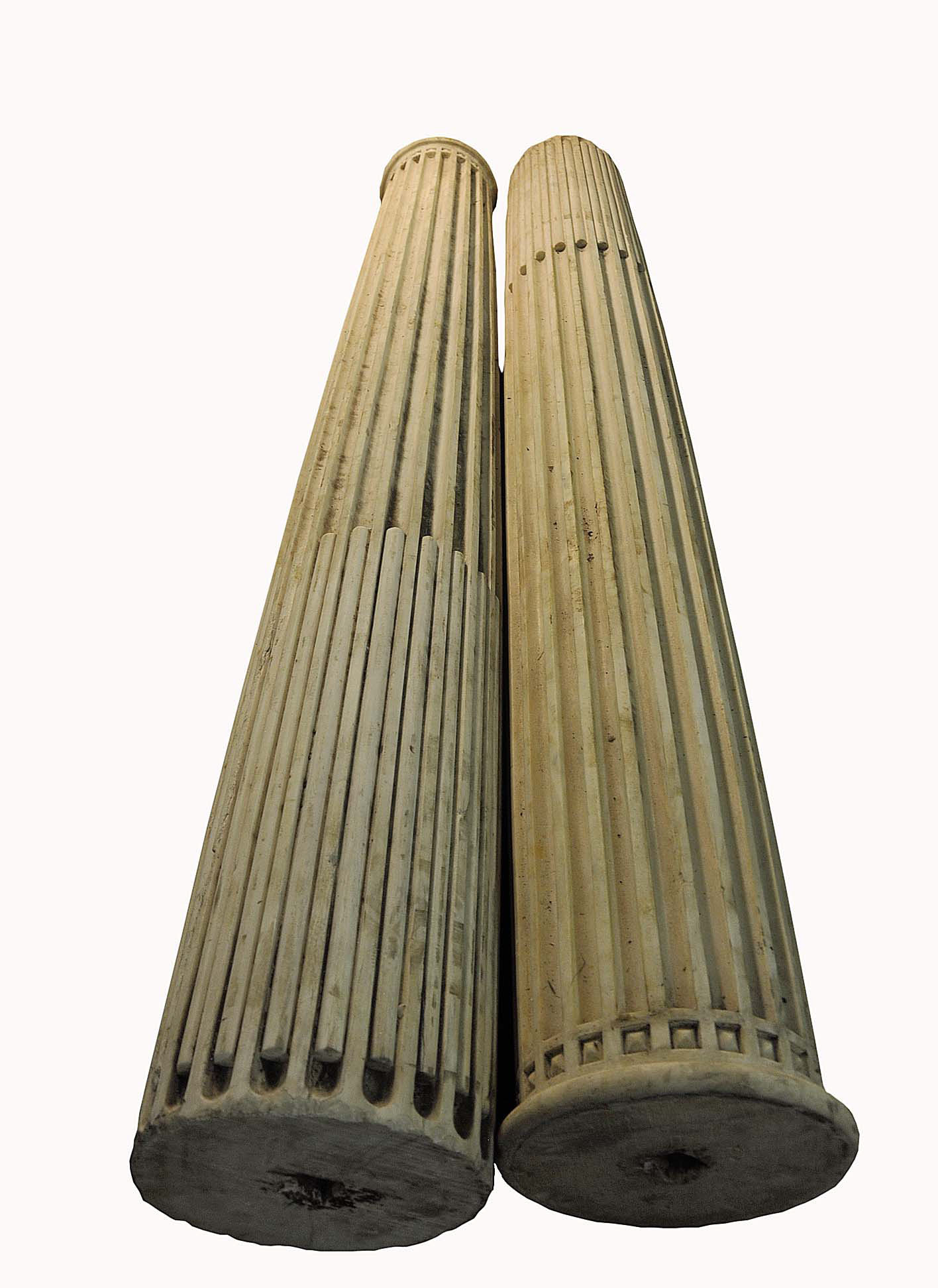 TRE COPPIE DI COLONNE Produzione moderna (?) Marmi diversi I coppia 278x37 cm. Stato di conservazione Superficie: 80% Struttura: 80% (restauri, danni alla base) II coppia 271x29,5 cm. Stato di conservazione Superficie: 80% Struttura: 80% (restauri, frattura) III coppia 277,5x36,5 cm. Stato di conservazione Superficie: 80% Struttura: 70% (restauri, frattura a metà della seconda colonna)