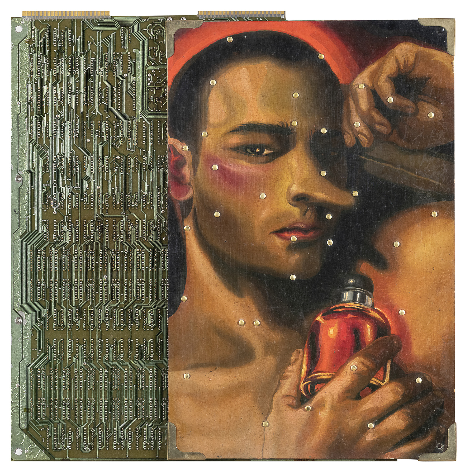 Tecnica mista su cartello pubblicitario con circuito elettronico e guarnizioni metalliche, cm. 47 x 45,5