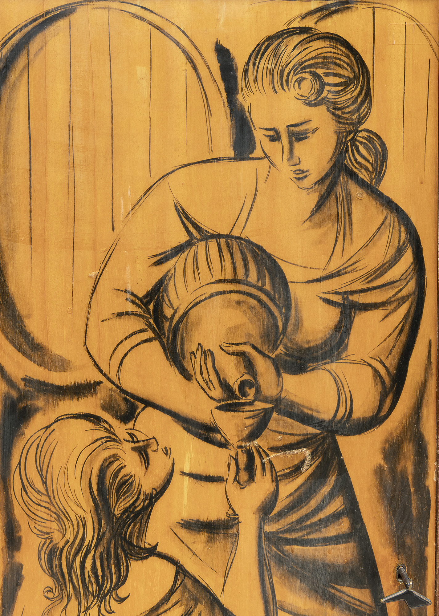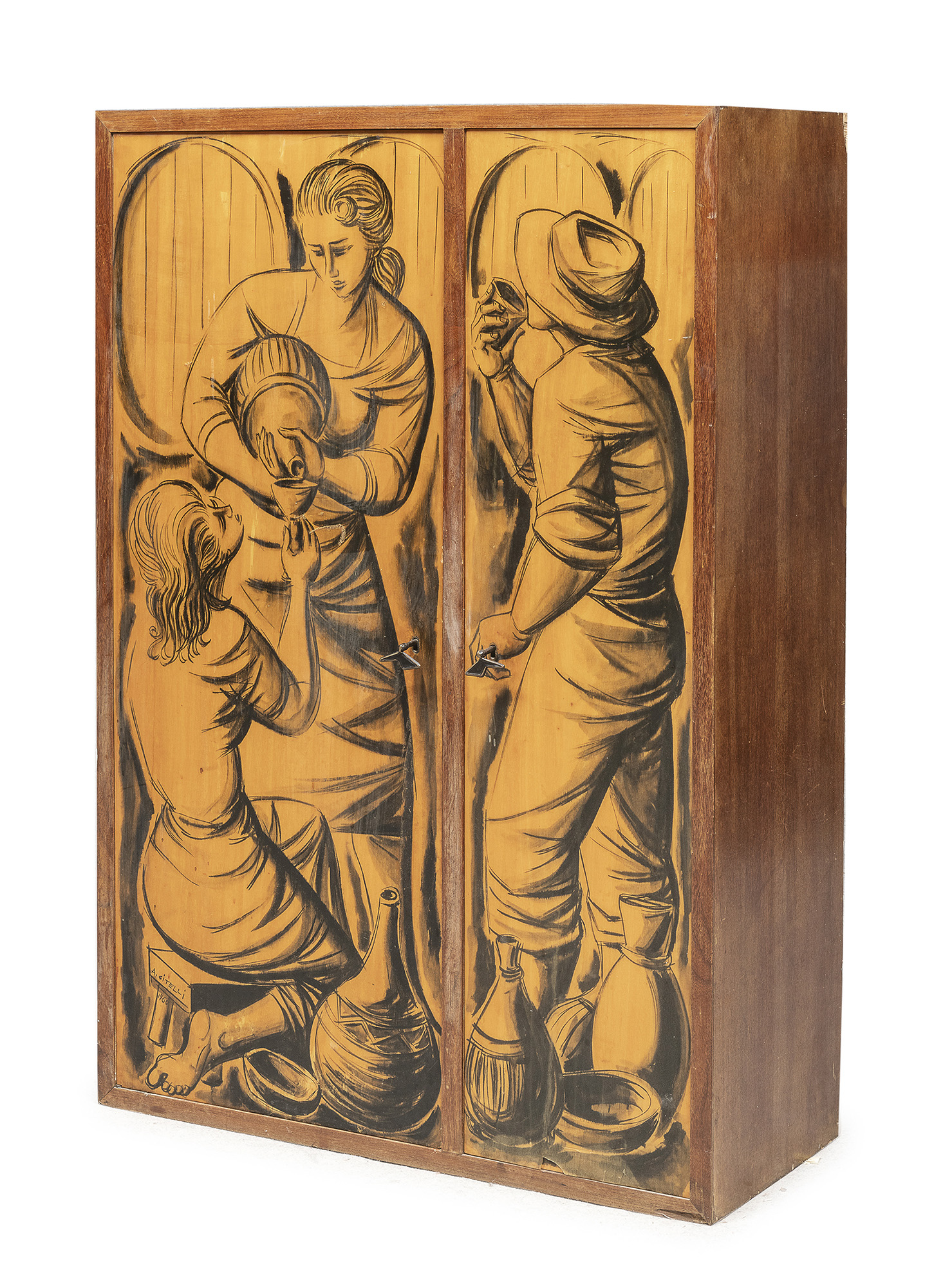 con esterno in legno tinto a mogano. Fronte dipinto a scena di pranzo di contadini in monocromia. Fronte con sportello destro a cassaforte e sportello sinistro ad abattant.