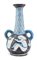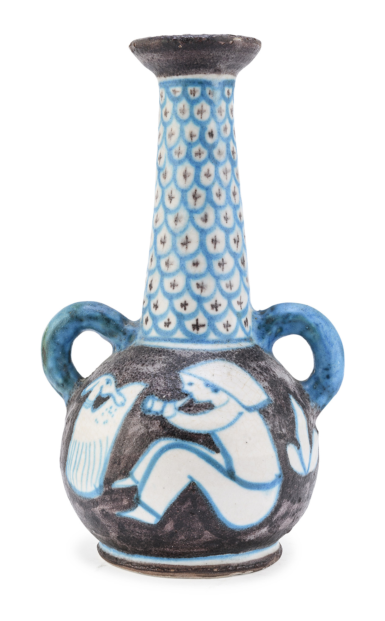 a corpo dipinto e invetriato con decoro di figure e animali nella parte bassa e decoro a piume dio pavone al collo.