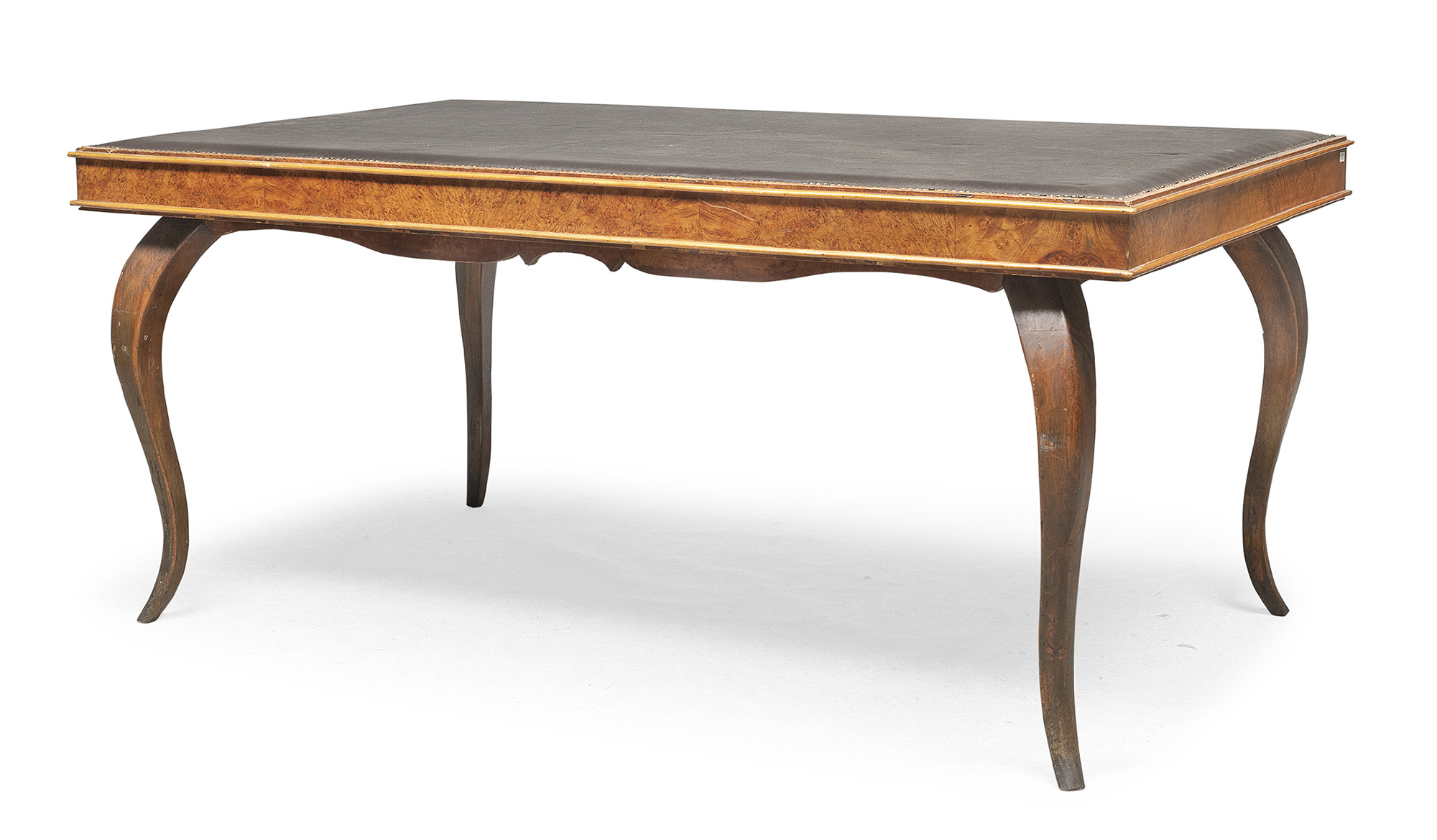 con piano rettangolare in pelle nera a cuscino. Fascia placcata in radica di ulivo, gambe arcuate di linea sinusoidale.