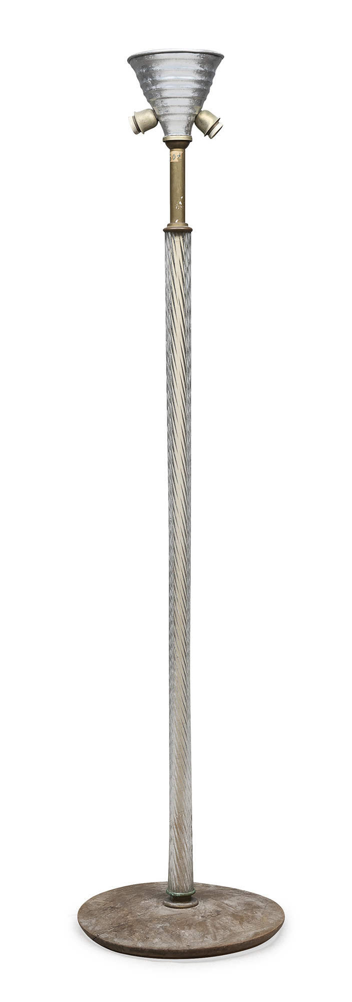 in metallo dorato, con fusto in vetro sagomato a tortiglione. Piede circolare.