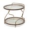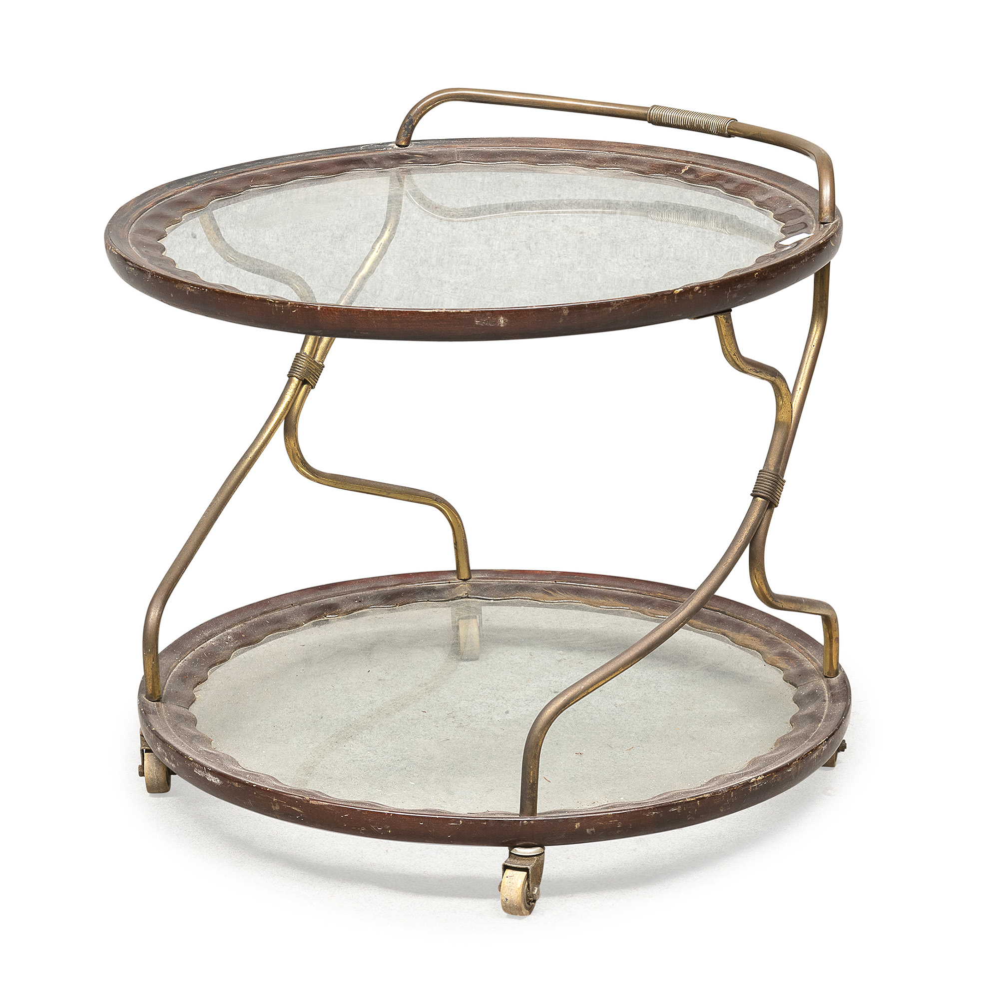 a sagoma circolare a due ripiani in vetro e montanti in ottone a racemi legati. Completo di rotelle.