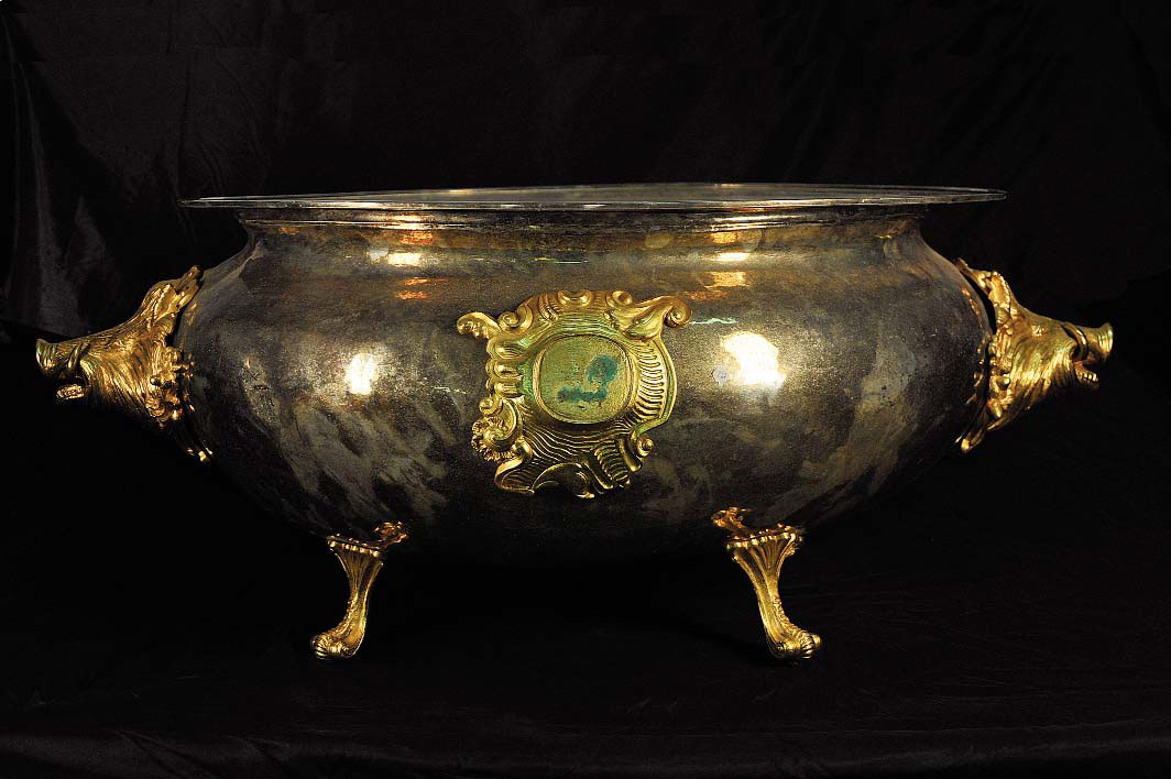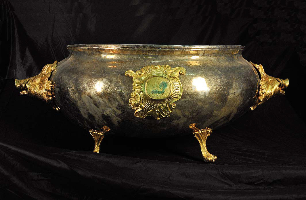 GRANDE BRACIERE CENTROTAVOLA Produzione italiana (?), fine del XX secolo Lega d’argento, bronzo 41,5x112x77 cm. Stato di conservazione Superficie: 95% Struttura: 100% Note: In tre parti: struttura esterna, contenitore per acqua, vassoio Sedi per blasoni libere ai lati