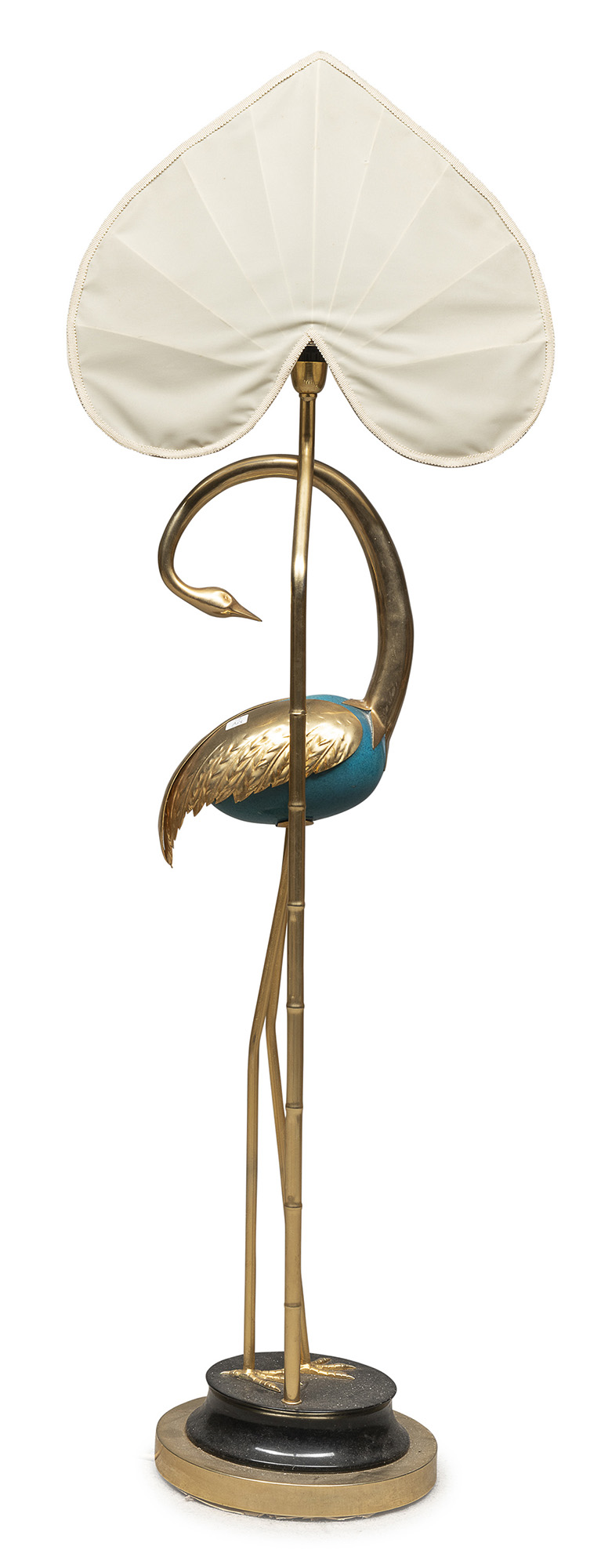 con ventolina in seta a fiore di loto, montante a canna di bambù affiancato da figura di fenice con dorso in smalto turchese. Piede in marmo nero.