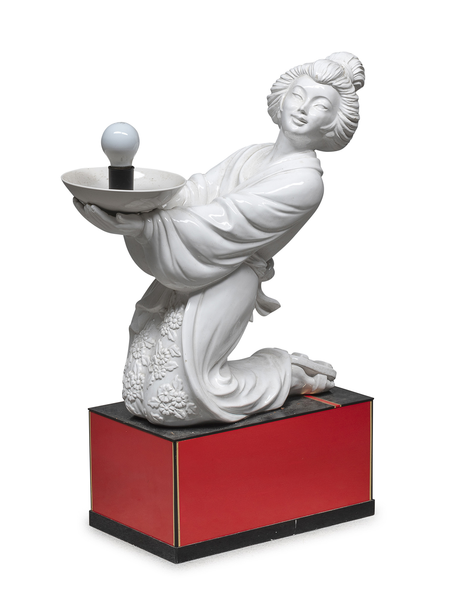 interamente a smalto bianco, sagomata a figura di cinesina offerente. Base in metallo laccato.
